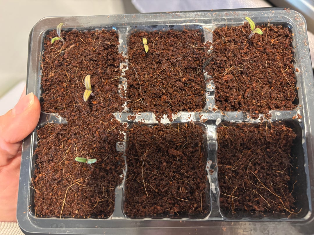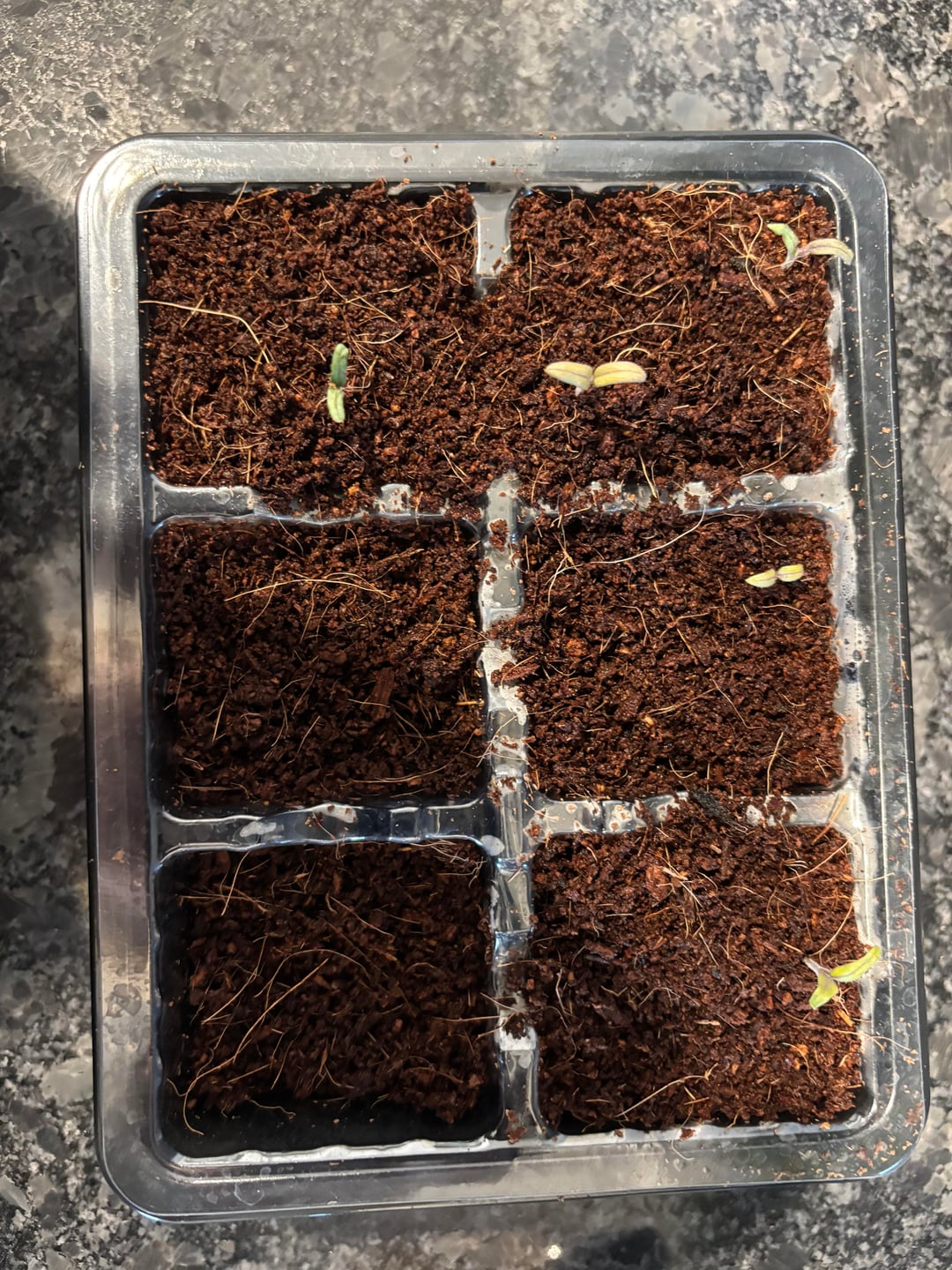 If the soil isn’t wet when adding it to the tray, it will sink down…no biggie there, but you may have added soil a bit too soon. I grow in solo cups with holes in the bottom and add soil as the plant grows…this is for tomatoes and other viney plants. I keep my soil super moist until the tomato leaves pop, then water when the top feels dry. Keep the lights 1-3 inches above the plants to avoid getting leggy and subsequently burned.