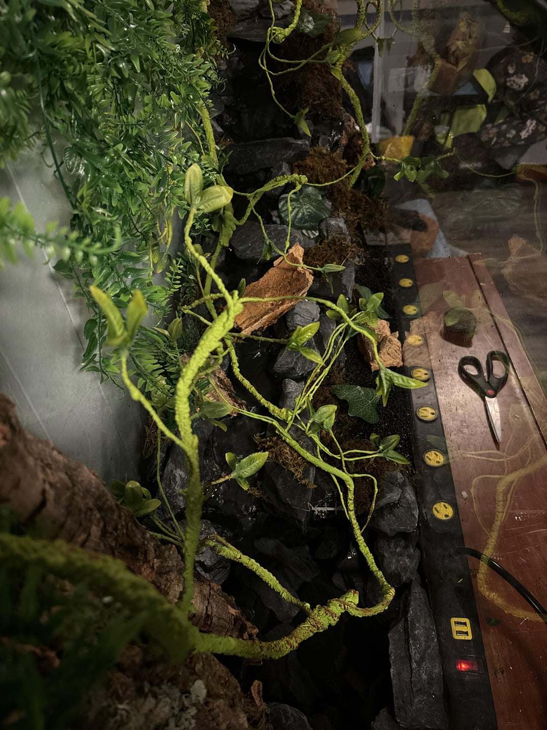 The tank is 100 gallon fish tank with a running river over slate rock into a pool about 3 inches deep. There’s only about 4in by 3 ft of soil to the front of the terrarium.