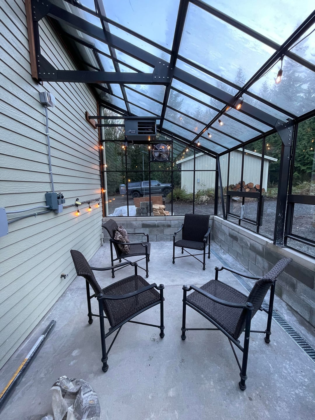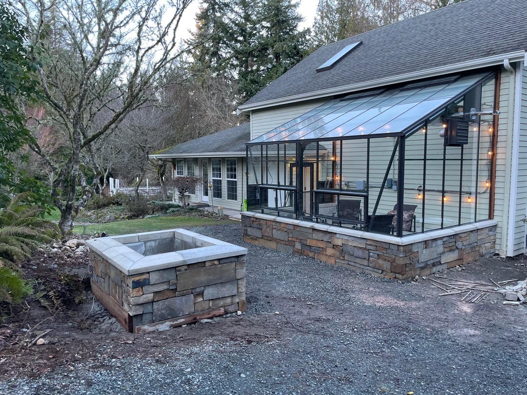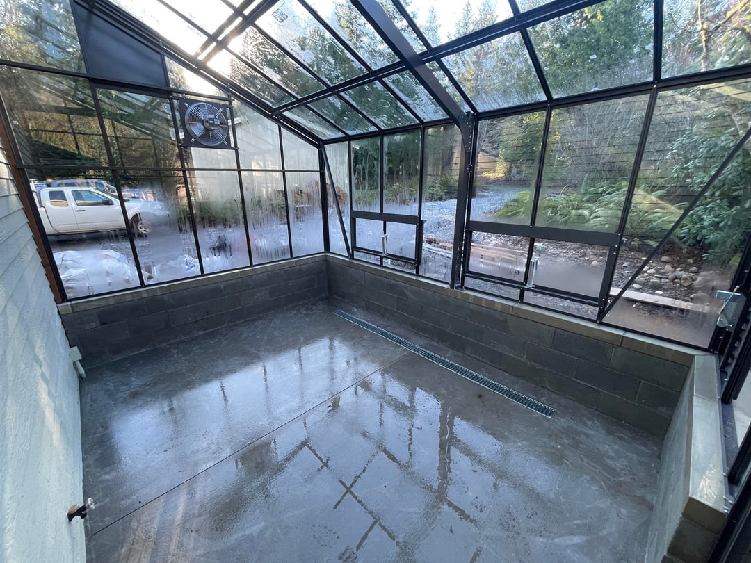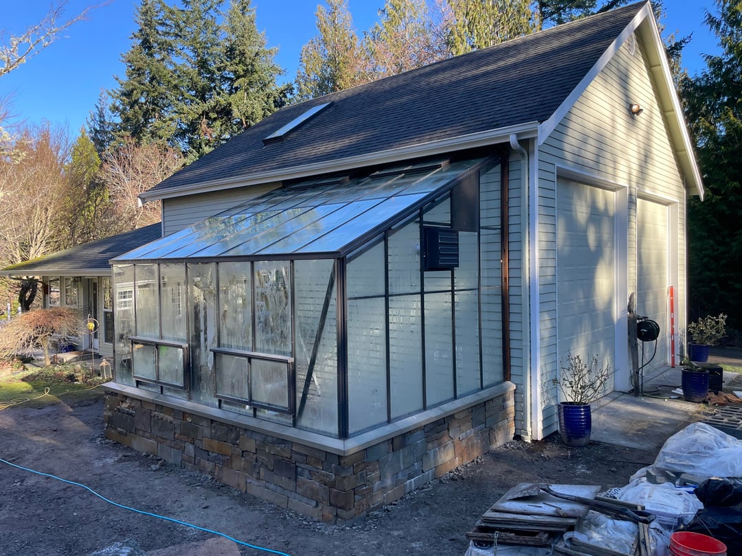Finally completed our 14’x10’ custom BC Greenhouse build! This project took about six months from idea to completion. This is the 6mm glass version, with shutters, exhaust fan and 45btu gas heater. We poured a thickened edge slab that was 20” deep on the sides and threw up a 28” foundation CMU wall with real stone veneer on it (and built a matching planter with the extra materials). I installed 220v for grow lights to help with light during our winter months (we’re in Western Washington) as well. The string lights are temporary maybe until we figure out what general use lighting we want, and I still have to attach the loose conduit to the aluminum structure.