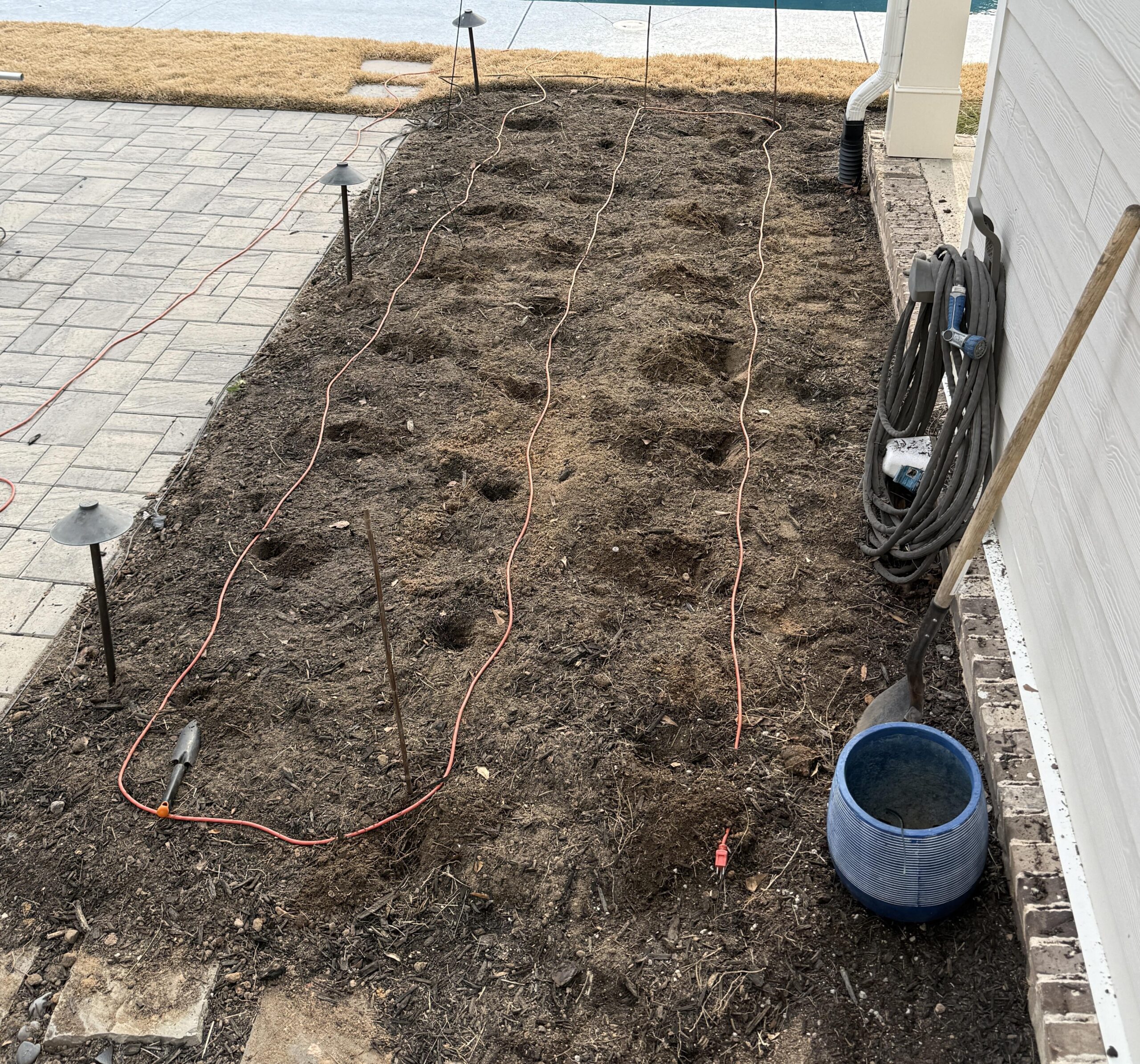 Seeking guidance on spacing drip line. Using my extension cord as visual. Does each row get one (or two) lines of drip hose? *Original post on FB DahliaAddict page.