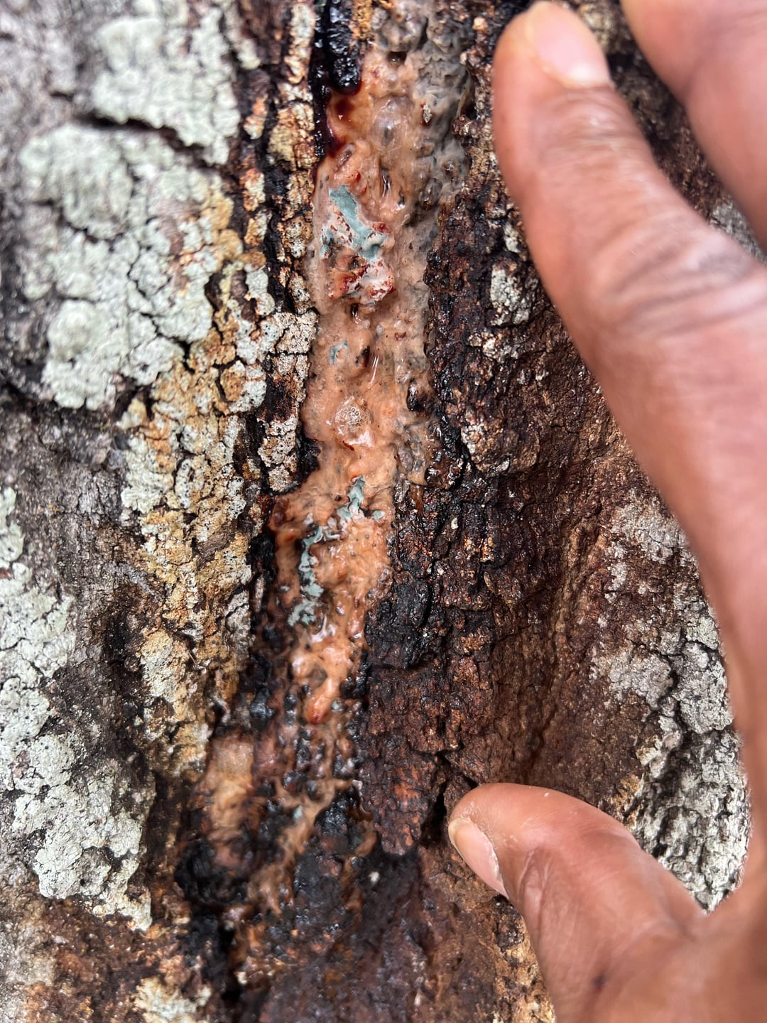 Dying. The infection is pretty bad if you’re seeing either slime flux or a bacterial infection take hold in the vasculature. It might also have been residual moisture in the tree that split open living tissue, resulting in this flux. It’s also probably worse because it’s spring, more nutrients are being mobilized to the canopy and you’ll see an even greater “leak” if the internal tissue has been damaged.