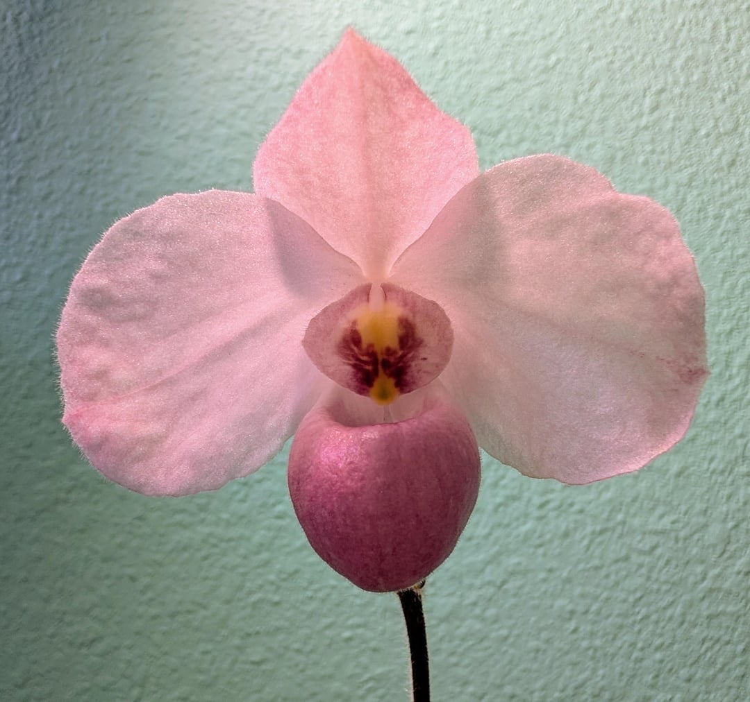 From SVO's line breeding program for this species. My first species paph, and it definitely lives up to its reputation as an easy bloomer. Fragrance is pleasant, too. Very light, so it's hard to really classify, but I'd say some notes of rose and vanilla.