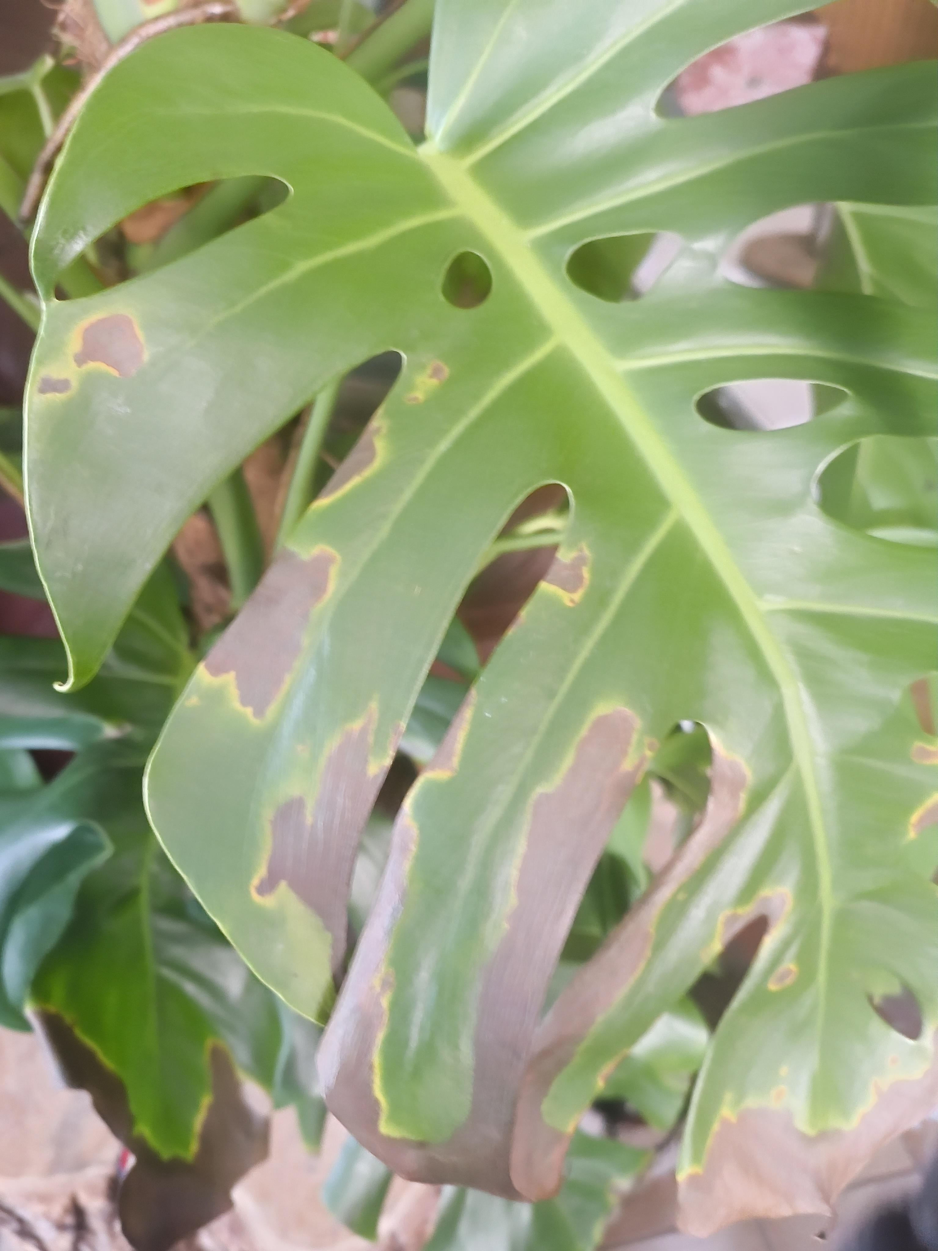 Hello, I recently got this wonderful plant but from the beginning it had these spots. I'm considering checking for rootrot and repotting just in case, but could this be a different issue? I don't see any pests either. Apart from that, it's 3 plants in 1 pot, circling one mosspole (the classic gardening centre combo). Would it be advised to seperate them in 3 different pots, or all in 1 facing one direction? Thanks!