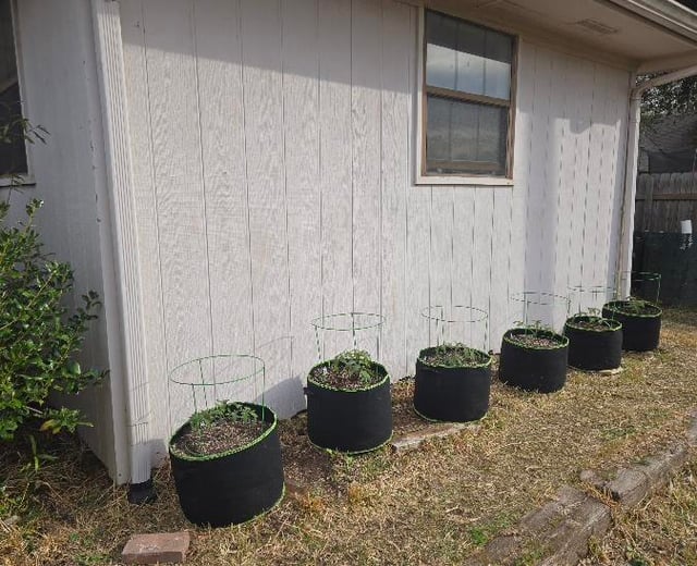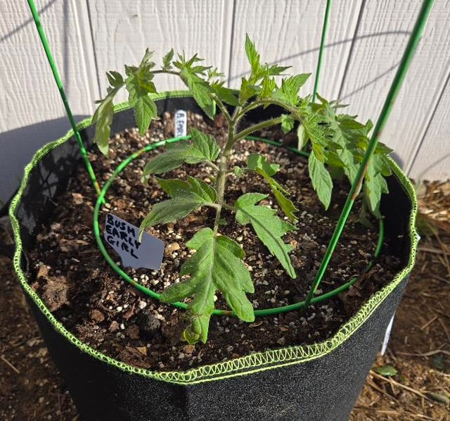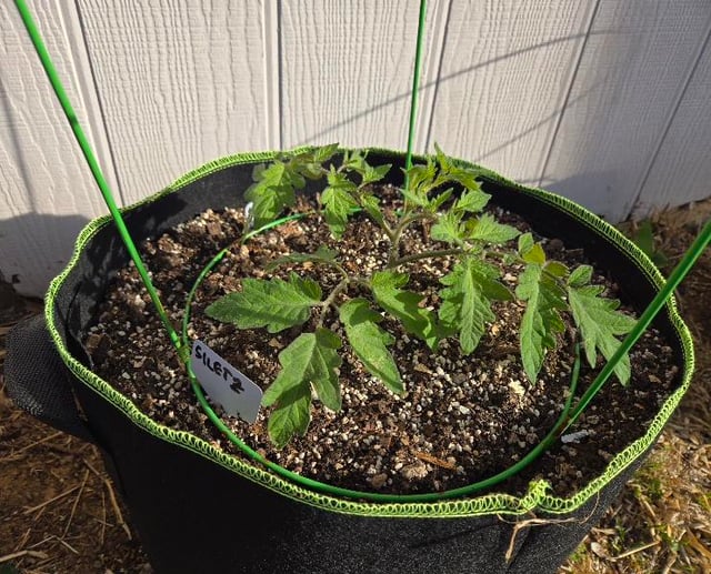 Planted them out Monday 16 February, about a month before our frost-free date. They are in 10-gallon grow bags set along a south-facing exterior garage wall, fairly well protected from our cold north winds. The light-colored wall should reflect light and give them a “solar push” now while the days are still short. Three each Bush Early Girl and Siletz, both of which varieties are cold-tolerant, early maturing determinates.