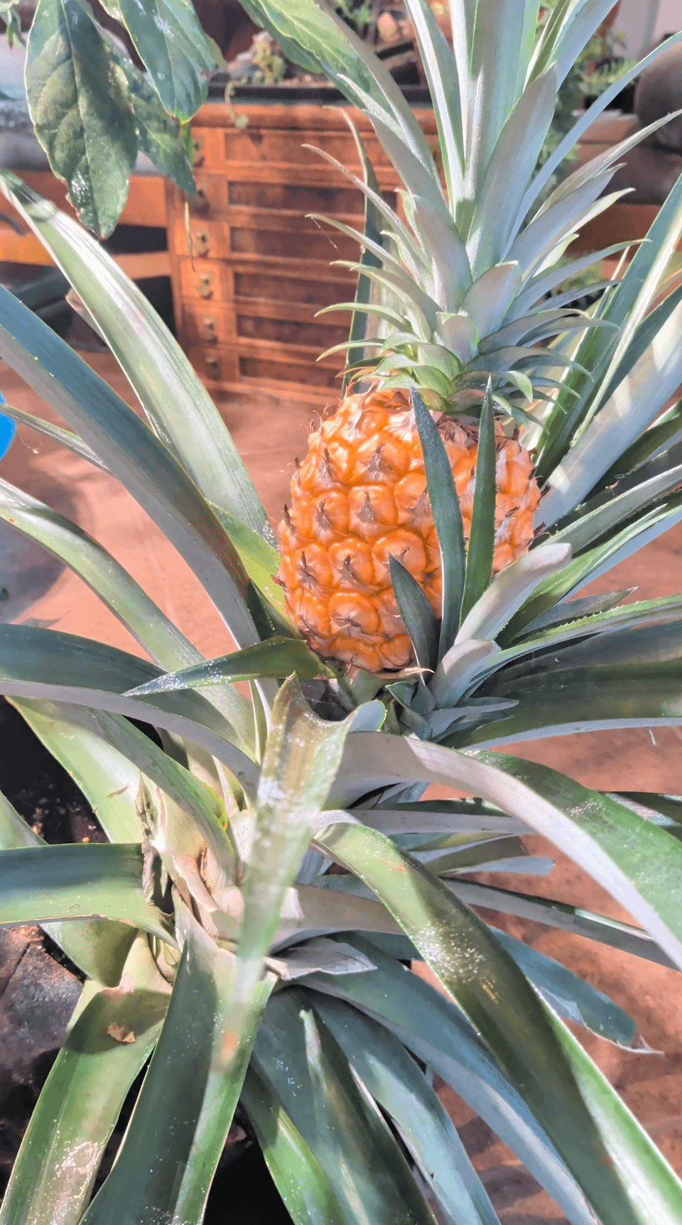 It took me a bit under 3 years to grow that pineapple from a store bought pineapple. I've been told that it takes much less time for a slip or sucker and I look forward to comparing the growth of all three!