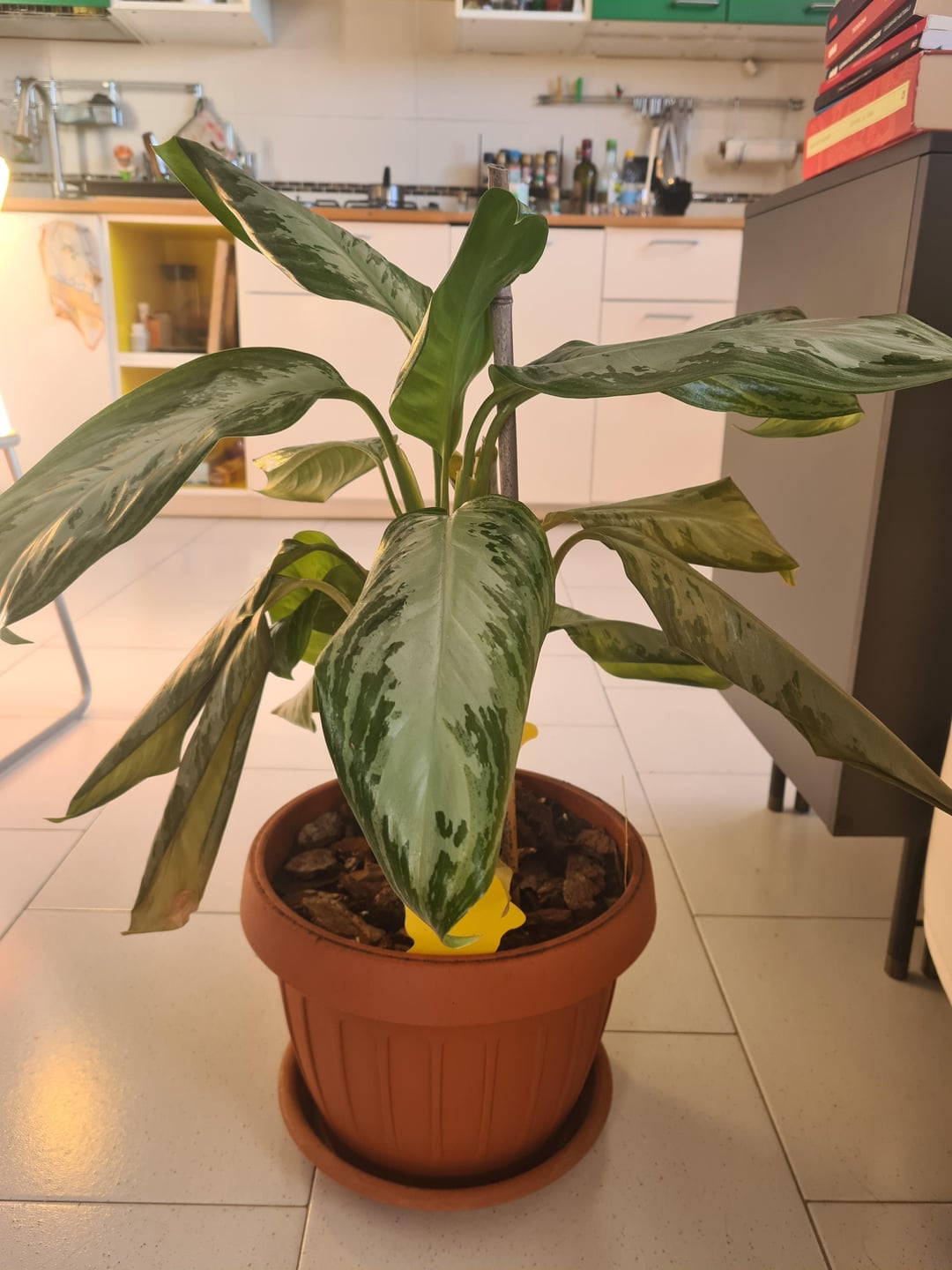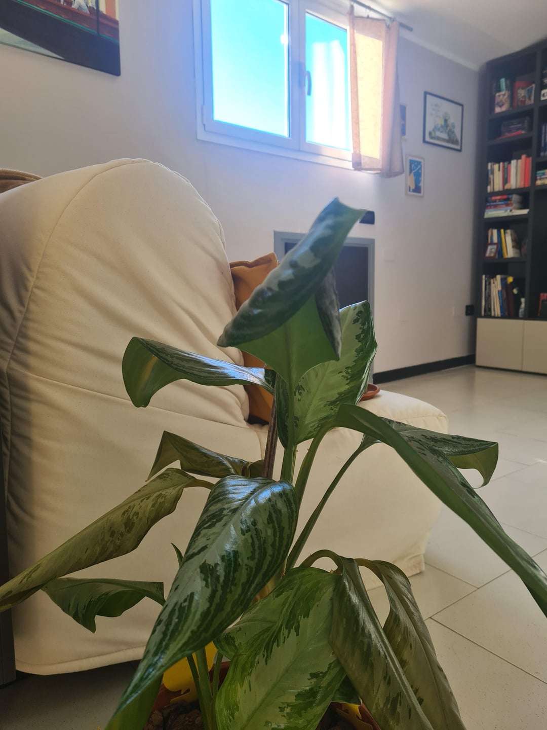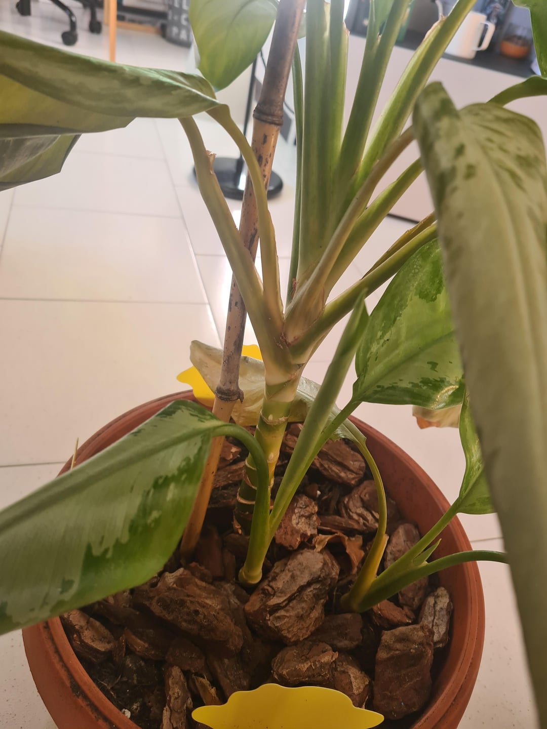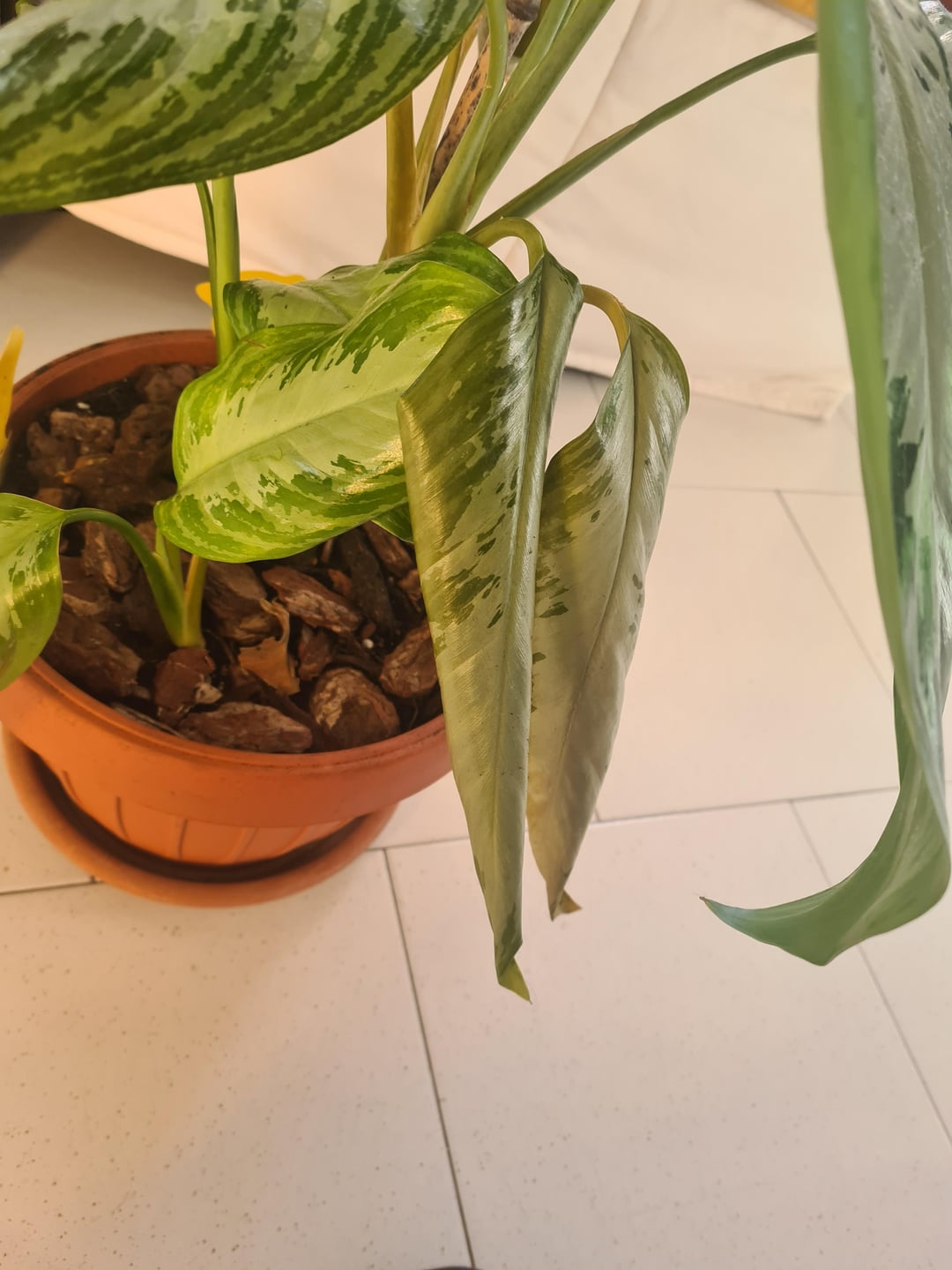 I need help with my dieffenbachia!! I am so sad to see her like that 🥹 Last month, soil was very wet and fungus gnats were flying around the plant. It was not a bad infestation, but I noticed that the soil was too wet, so I decided to change the soil and add perlite and extended clay at the bottom. I covered the top with bark to prevent new gnats. After repotting (3 weeks ago), I watered only once. My house is very humid so soil takes a lot before drying.