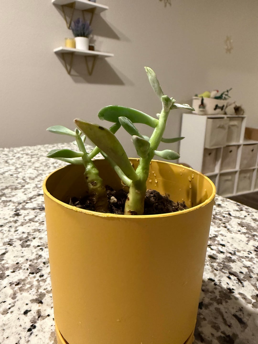 The tag said it was an echevaria lola, which I didn’t believe because it has never looked like any of the photos I’ve seen. It’s deformed and it’s struggling, but it’s survived for 4 months, so I’m trying. It was getting crowded in the pot it originally came in so I put it in this bigger one with succulent soil.