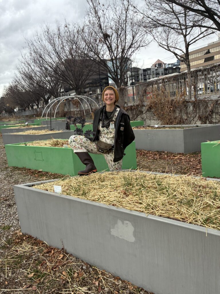 Garden Associate and Seed Librarian Rikki Longino stands in a plot at the Salt Lake City Library. (Bryanna Willis, KSL)