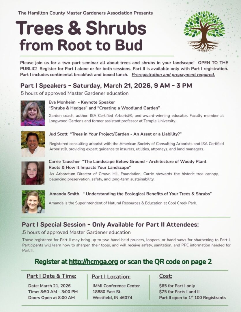 The Hamilton County Master Gardeners Association presents a two-part seminar on how to take care of trees and shrubs. The first session is scheduled for March 21 with the second a week later on March 28. Both are open to the public.