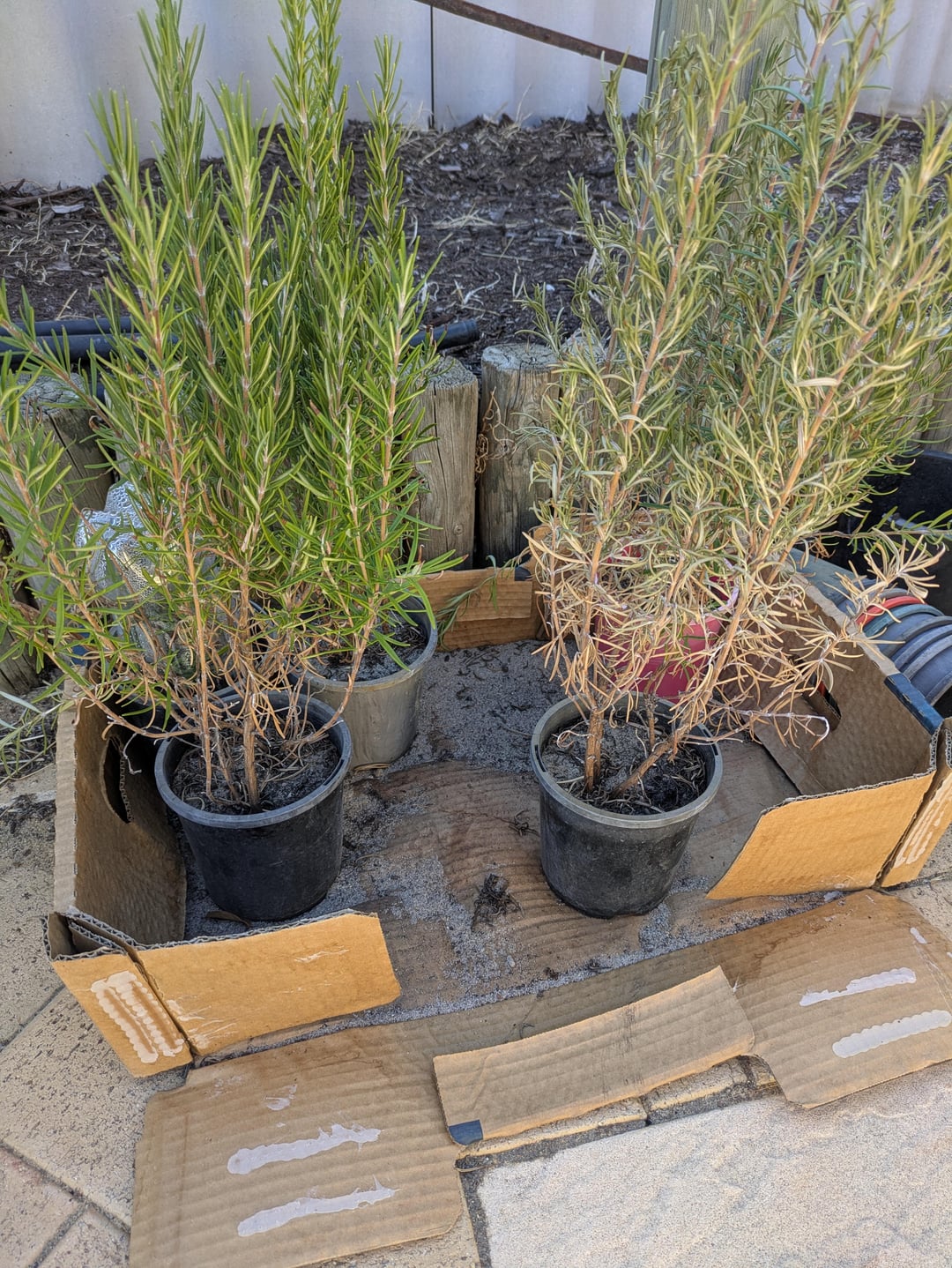 The potted ones are drying out. Hard prune, into the ground, good soak, and keep moist for a few weeks. Persist, rosemary is tough