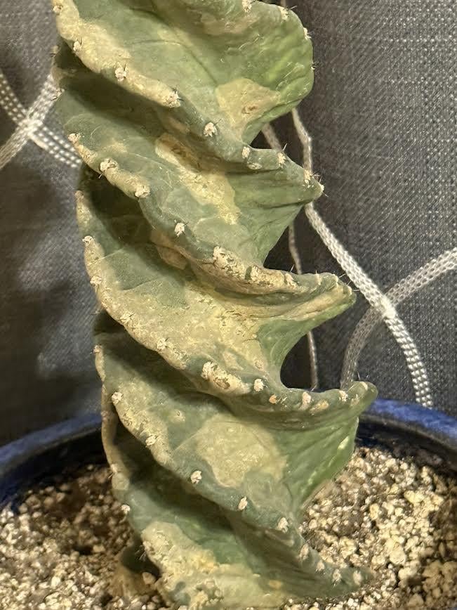 I spoke with a cactus expert about my spiral cactus recently (my cactus looks similar to yours) and he said that the spots were from under watering. He said that spirals are a bit thirstier than some other types of cacti.