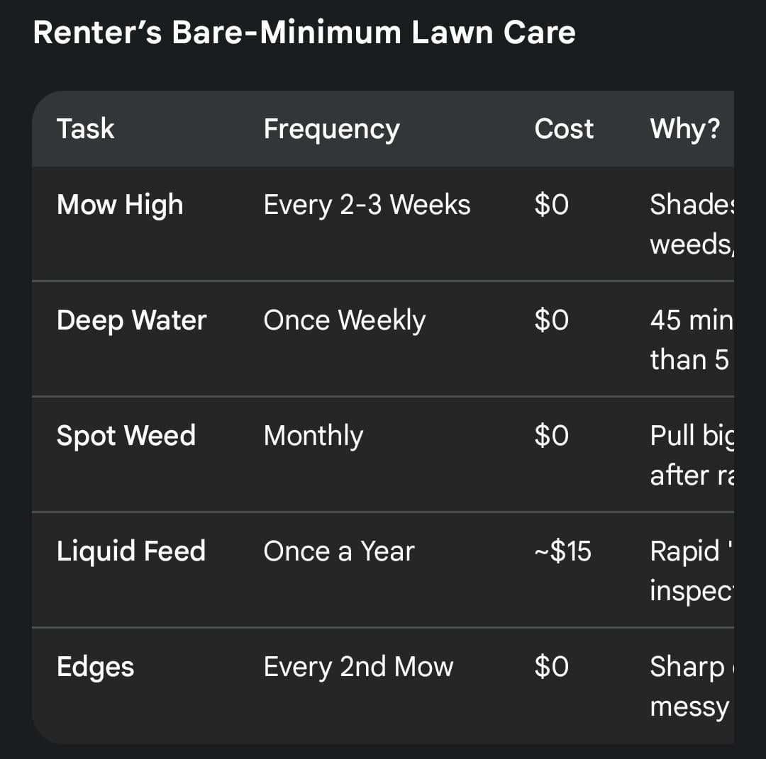Anyway, we are moving house (into another rental), and I asked AI what are the bare minimum lowest cost options to keep grass lush and green, the screenshot is a summary of what it offered. Would love to know what you guys think?