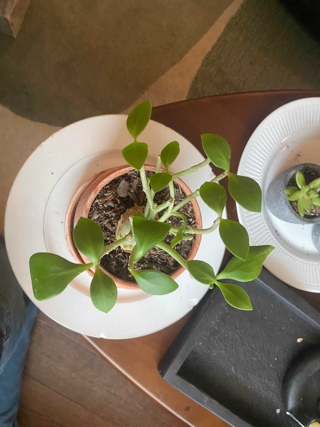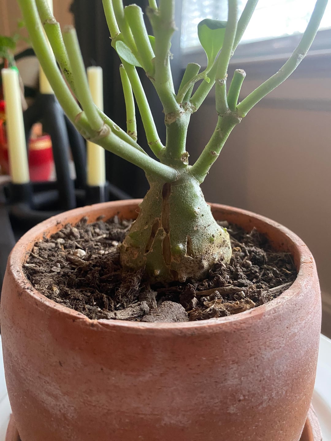 Plant ID says it is either a desert rose, jade plant (LOL), or maybe a baby rubber plant. I want to care for it as best as I can, so I need help identifying. The third picture’s grooves in it have me concerned and wanting to go the extra mile to identify.