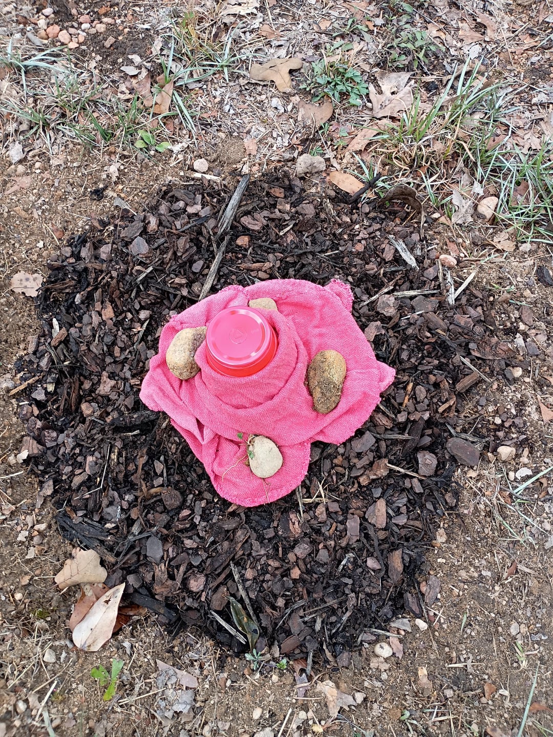 Have a cold snap coming as seen in 3rd pick. This is my solution, 2 solo cups with shop rags around base weighted down by rocks as seen in 2nd pic. Will this be enough?