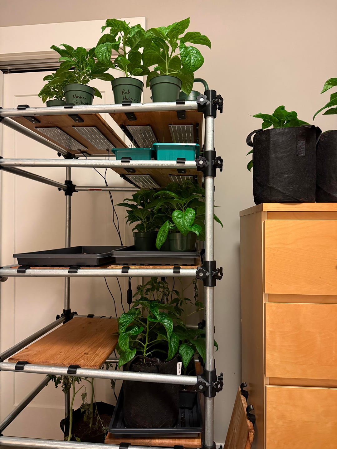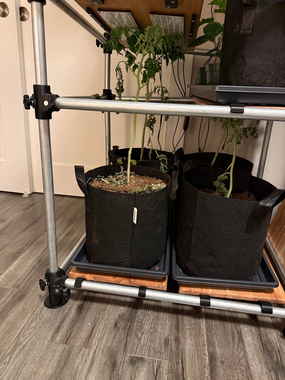 I don’t know what happened but the lower branches started to wilt and I moved up higher and higher. I bought a water meter and I do t think I over watered them. My peppers are doing great. I’m going to start over with the tomatoes next week, the timing will be much better and I can get them outdoors at around 4 weeks then…..