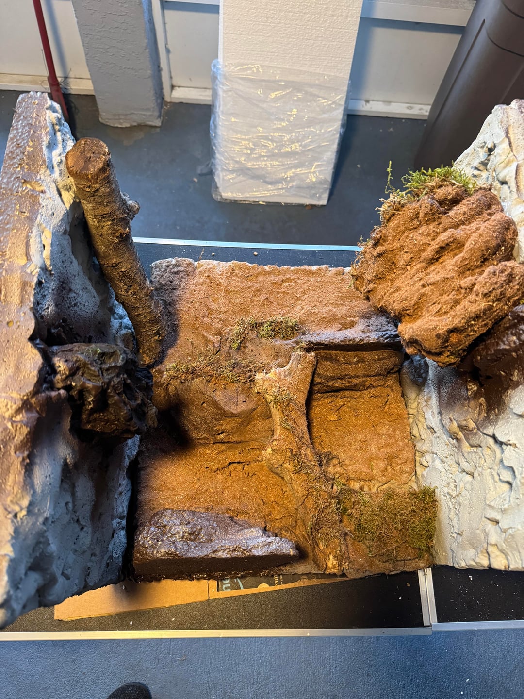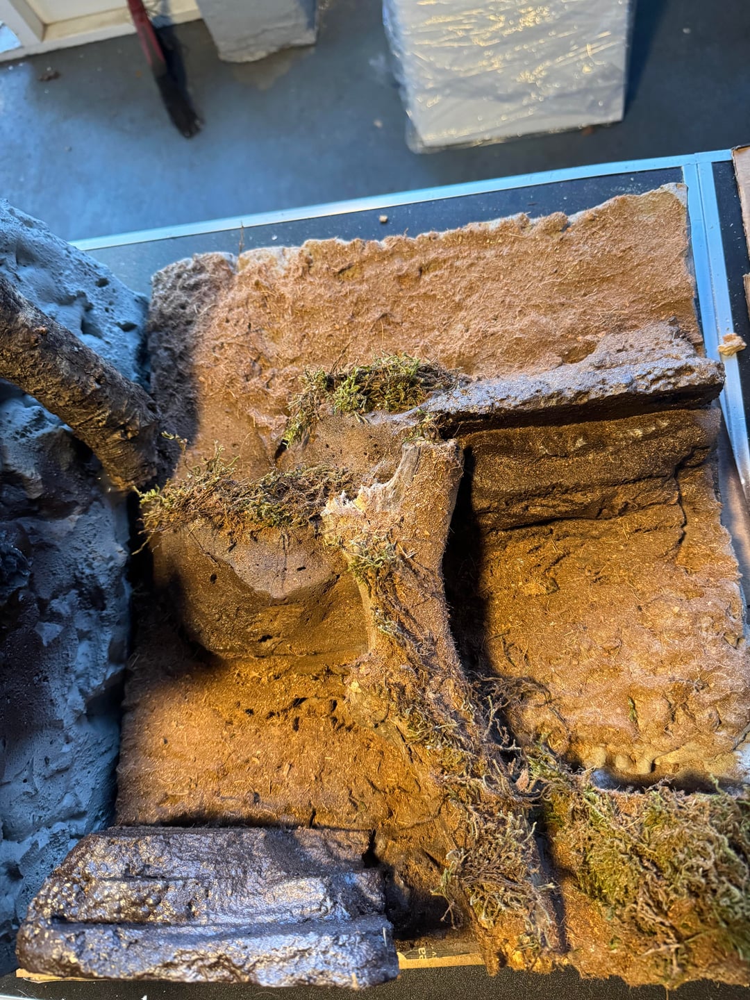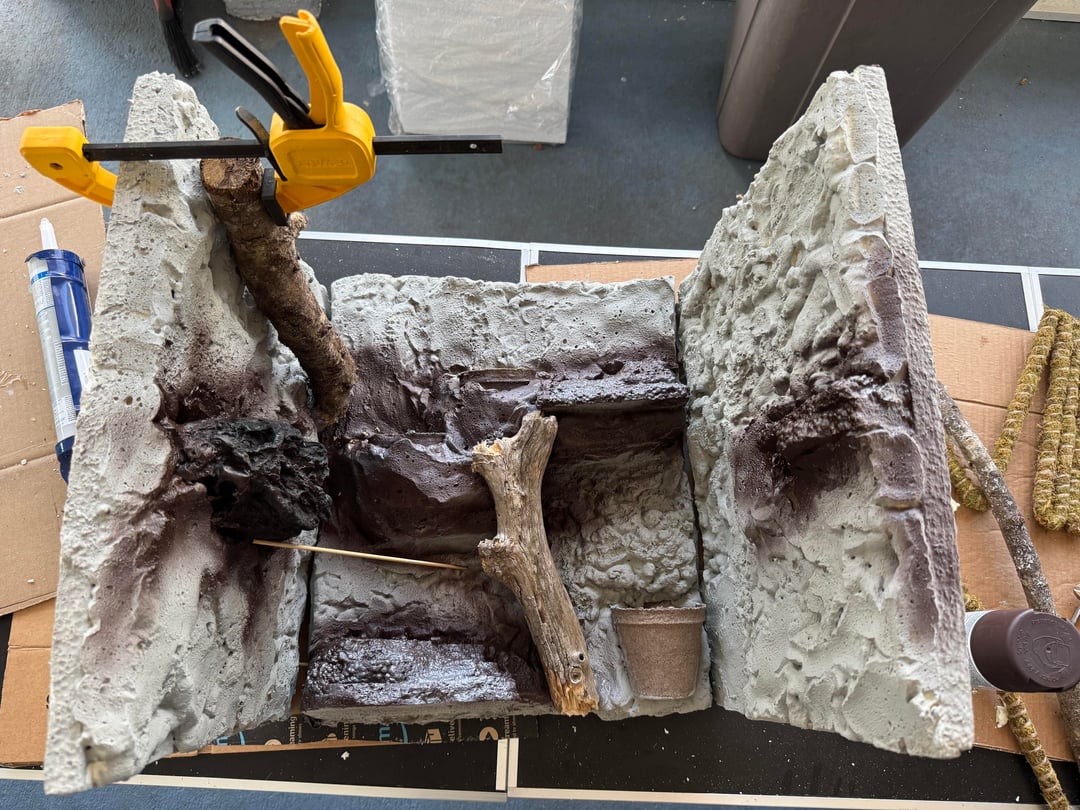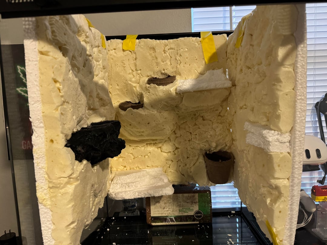 Built it with foam board from Home Depot. I did three sides and attached them with silicone. But I was able to build the panels outside of the tank and get them how I wanted them which was real nice. Used the great stuff original not the pond and I painted everything with drylok and different color paint.