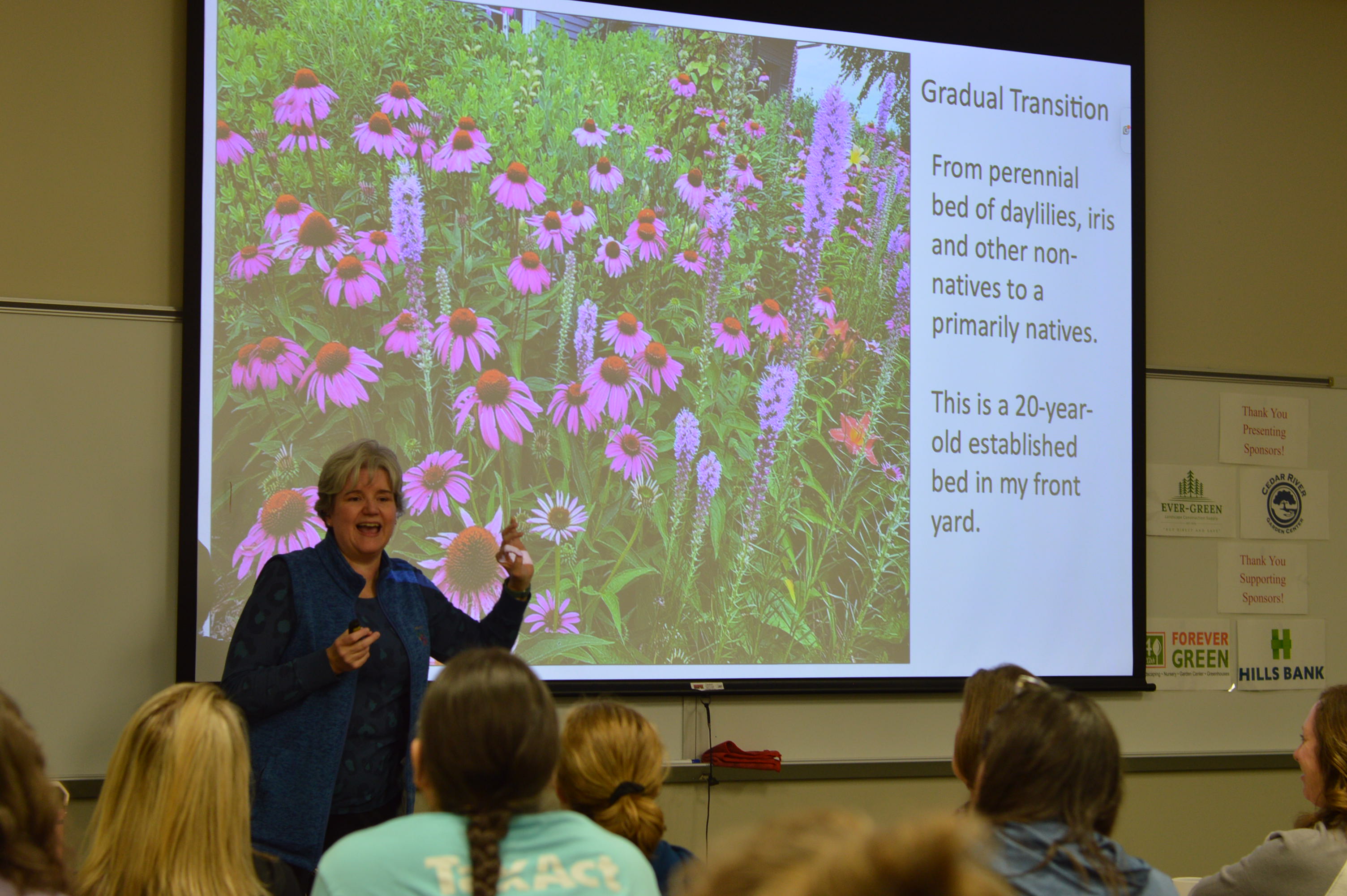 Midwest Garden Gal Lisa Hinzman Howard shows photos of her own yard during a presentation on micro-prairie gardening. (photo/Cindy Hadish)