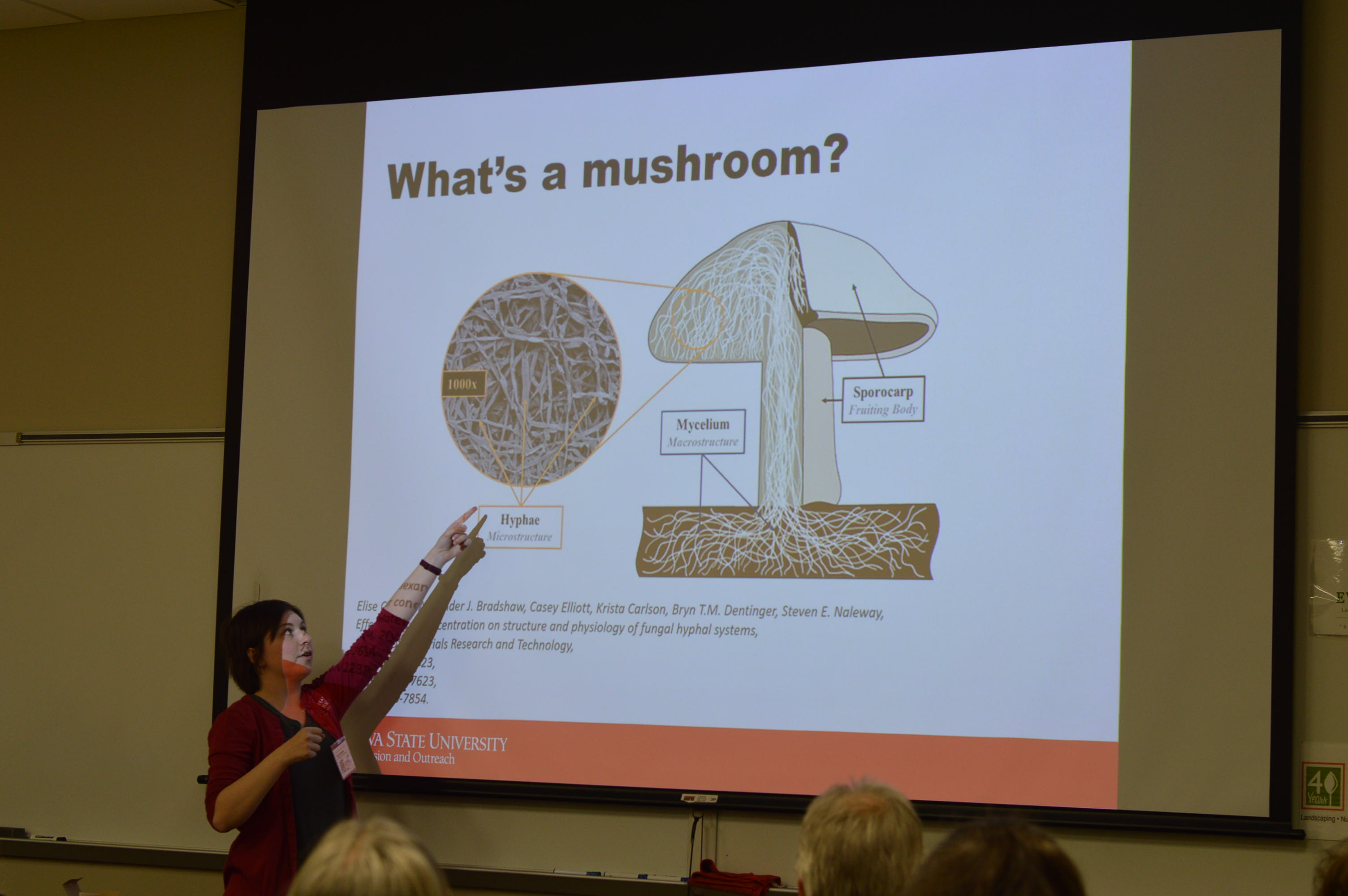 Gina Buelow, Natural Resources Field Specialist for Iowa State Extension Outreach, points to the parts of a mushroom during her presentation on mushroom foraging. (photo/Cindy Hadish)