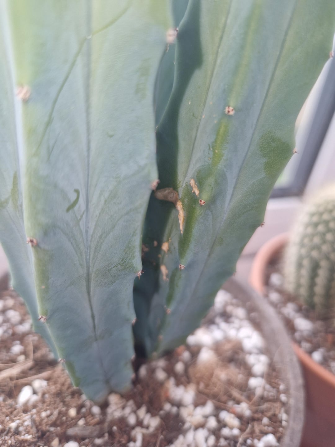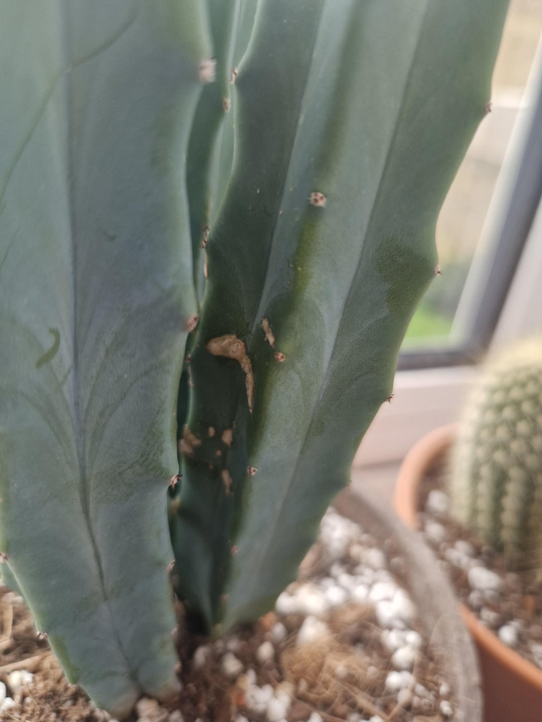 Hi! Ive just noticed these brown patches on the inside of one of my cacti, im not sure what this indicates? They are hard and very slightly raised parts. Ive watered it maybe twice over winter so i dont think it could be overwatering… it doesnt scratch off when i scratch it, any idead?