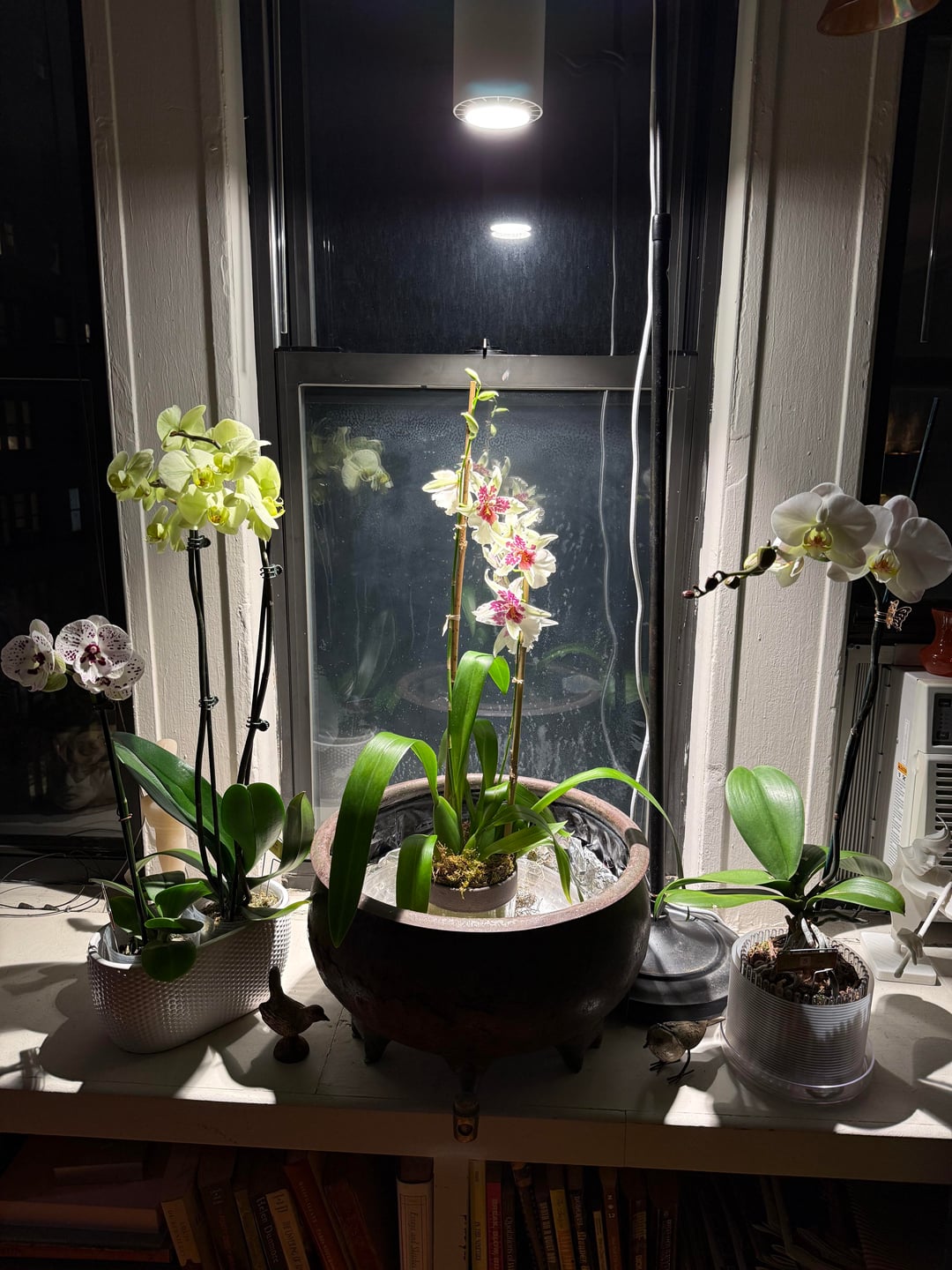 A dear friend who knows I love orchids gave me this Cymbidium for my birthday. My setup is perfect for phals, and I’m having great luck with them. But, according to Grok, I don’t have much of a chance of being as successful with this one. But it’s very beautiful, and I want to give it my best shot. I know it needs more light than the phals. As it happens, I just got a Soltech Aspect light for the living room to augment an east facing window that only gets light for a couple of hours in the morning before buildings block the sun. The stand for it is not arriving until next month, so I rigged something up for now. I could make it lower, but not higher.