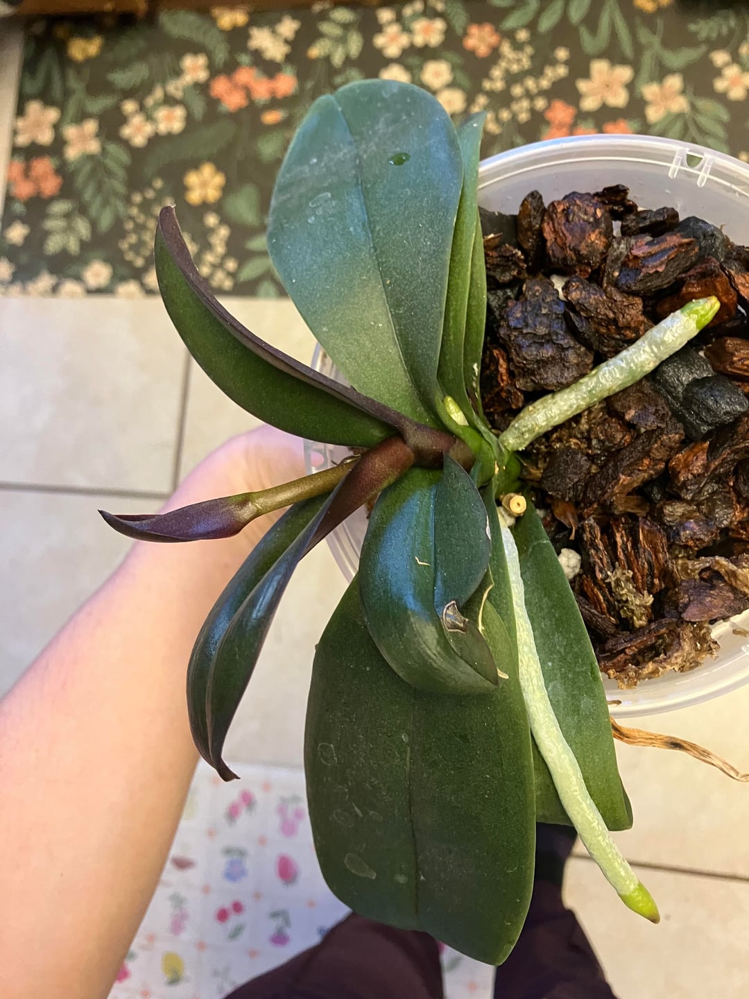 It almost looks like the leaf has a stem. It also looks like a new leaf is already appearing out of the stemmed leaf. I use an orchid fertilizer every week when I water (this phal had just been watered in the pic, I let it dry out completely before watering). My other phals are about to bloom but this one is doing its own, odd thing. Any thoughts are welcome. Thanks in advance.
