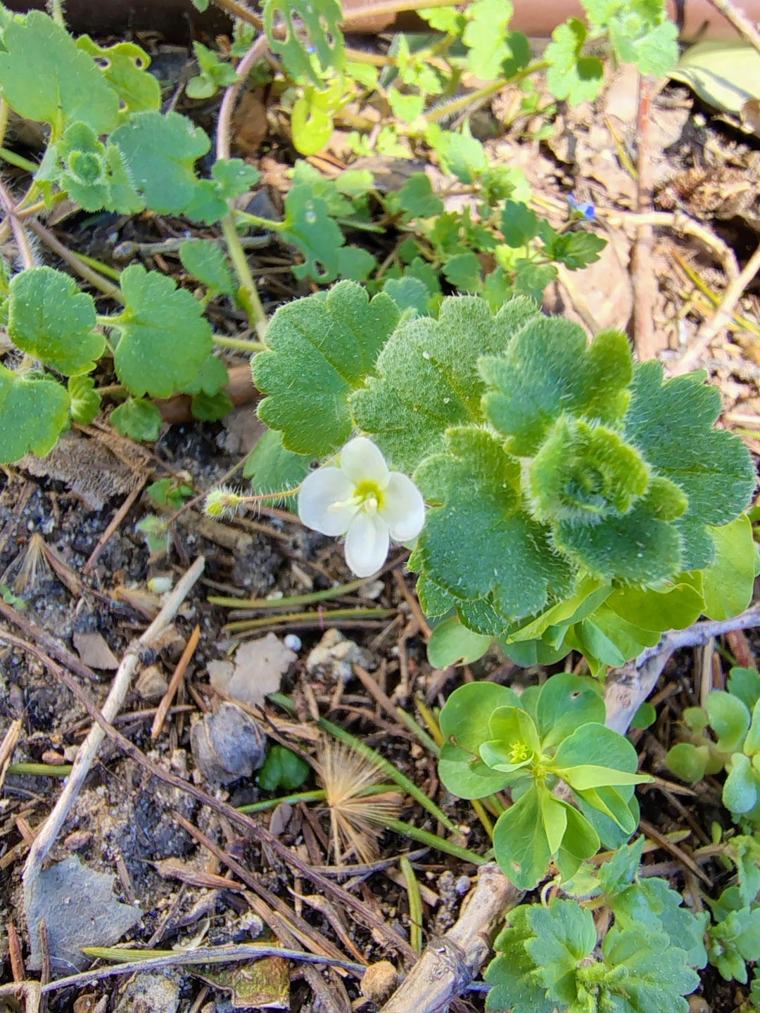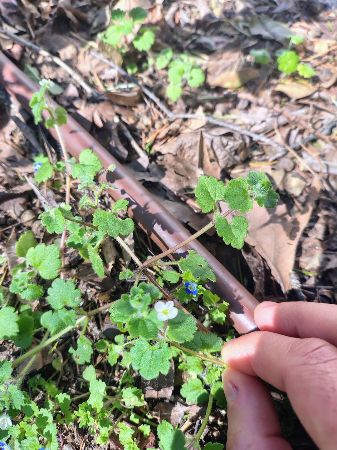 When I arrive to the genus Veronica my dichotomous key tells me to find EITHER blue flowers OR white flowers to decide between Veronica polita OR Veronica cymbalaria. I can't find any info on wether either of them can exceptionally have white or blue flowers. What do I do when that happens? Why is this plant showing both? Why is pigment lacking? If it helps, only terminal flowers seem to grow either blue or white.