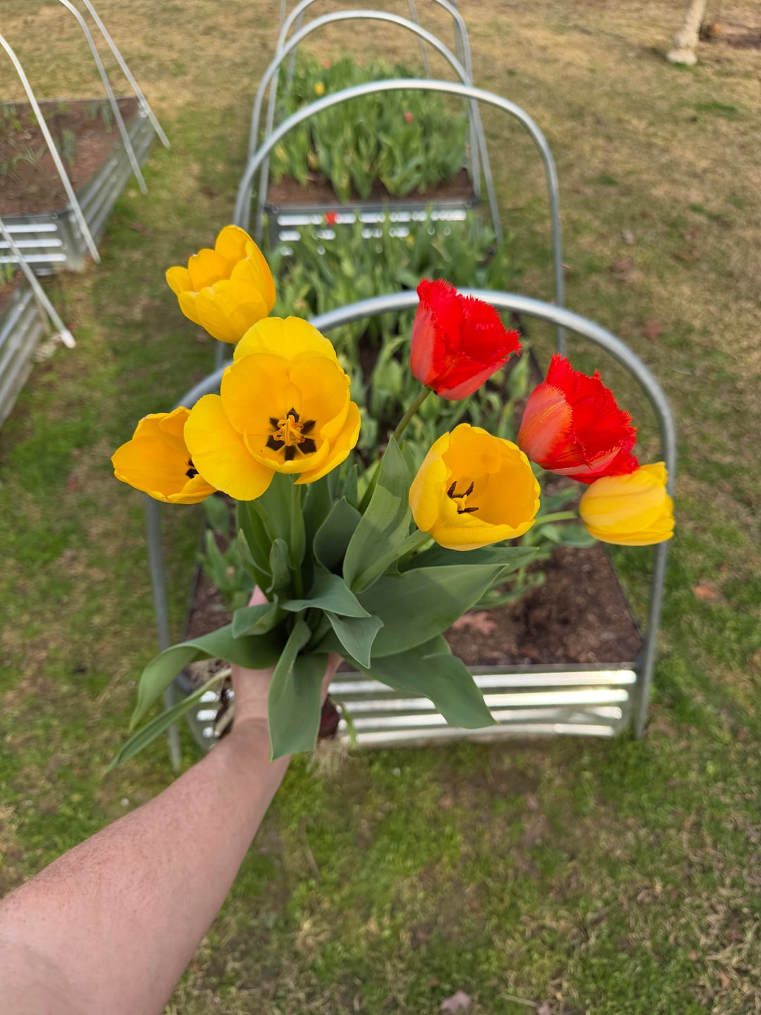 I started growing tulips two years ago and it’s become a yearly hobby of mine! I buy 1,000 count mystery tulips bulbs from Holland bulbs. I grow all mine in raised beds. I love the mystery bundles because I never know what style I’m growing until they bloom!