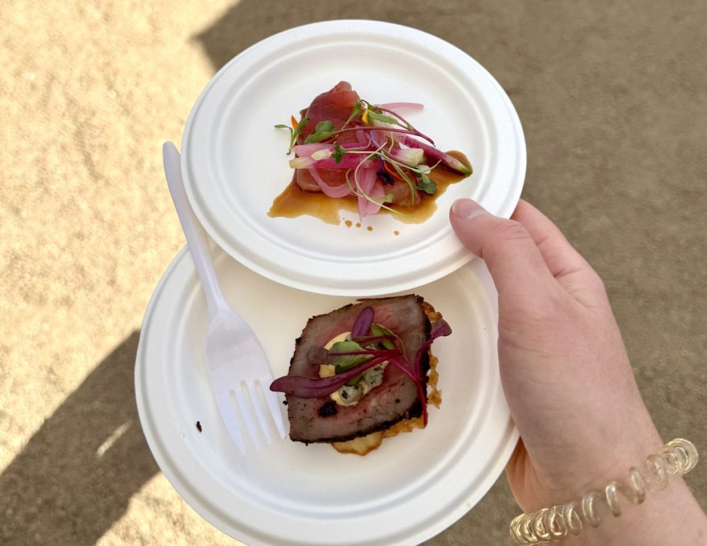 The Gladly chef Xander Barella made a a fresh tuna crudo with blood orange ponzu. Fellow Gladly chef Adam Harms grilled Hereford beef, plating slices atop a tallow-fried potato chip with crispy capers.