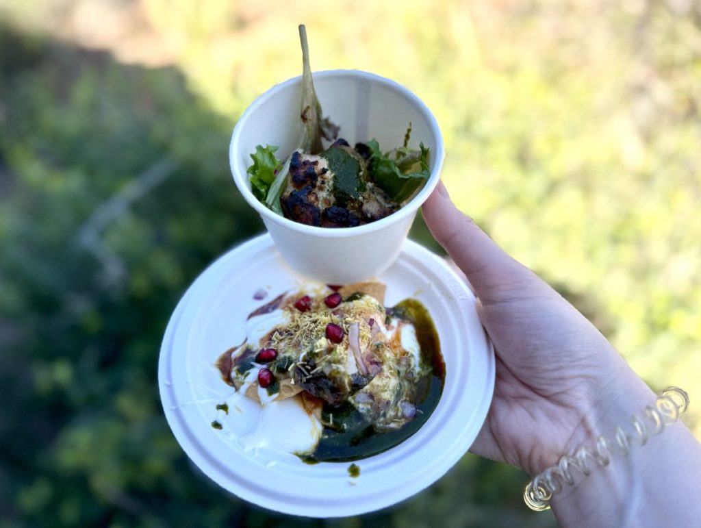 Indibar’s Afghani Murgh, a charcoal-grilled chicken with salad and pickled onions, and Papdi Chaat, a street food snack topped with potatoes, yogurt and mint and tamarind sauces.