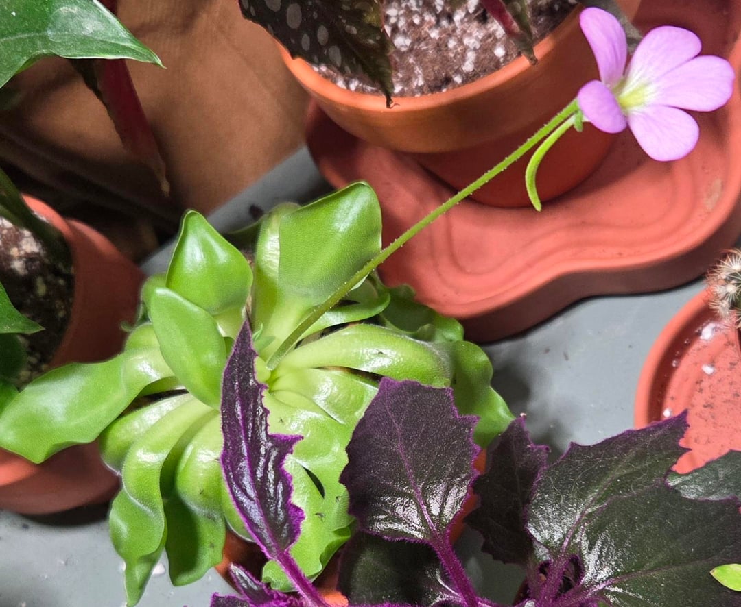 I bought my first Pinguicula last year and recently it has very rapidly sprouted a second head! First image is today, second is of the tall container with drainage (just replenished distilled water recently) and the third image is from November when it bloomed! I'm not sure what ID it is. Should I separate these two heads or look into a wider setup/terrarium and let it keep growing as it is? TIA for any help!