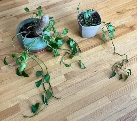 These 2 plants thrived for years (the one on the left came with the coco pole). Now they have yellowing leaves almost every day, which I remove. I let them dry out between waterings; I don't think I'm overwatering. I added some Osmocote Plus pellets maybe a month or so ago and pruned a bunch of leafless stems off the large one a couple weeks ago.