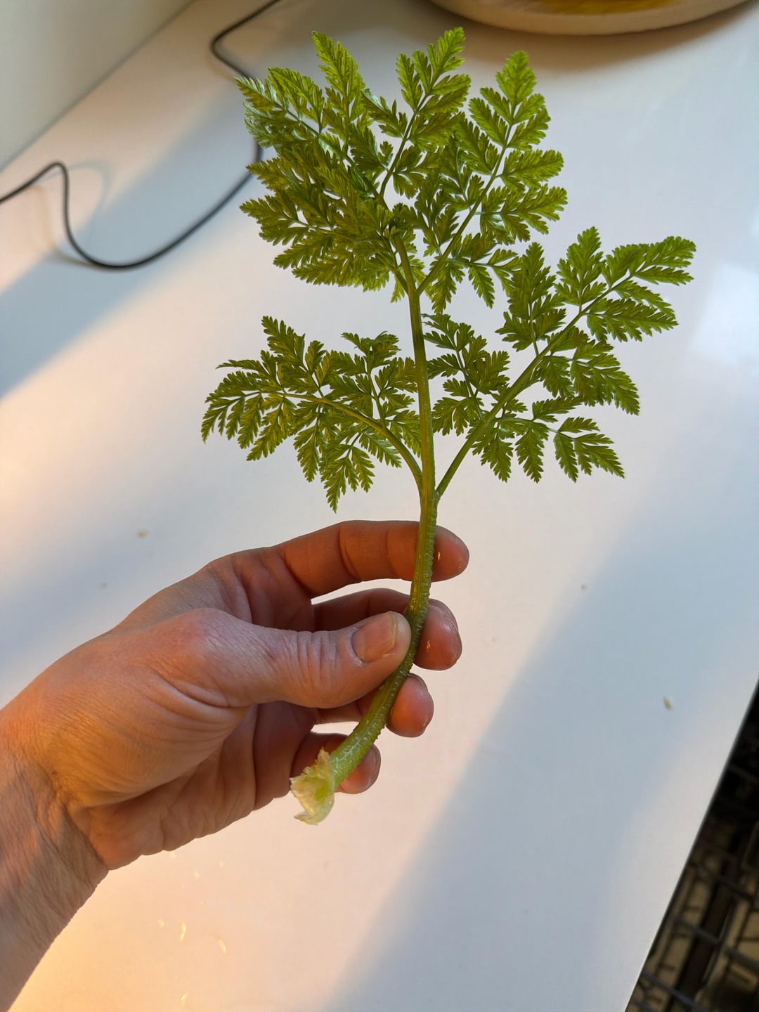 This is not hemlock, notice the hairy grooved stem and lack of purple blotching or powdery bloom.