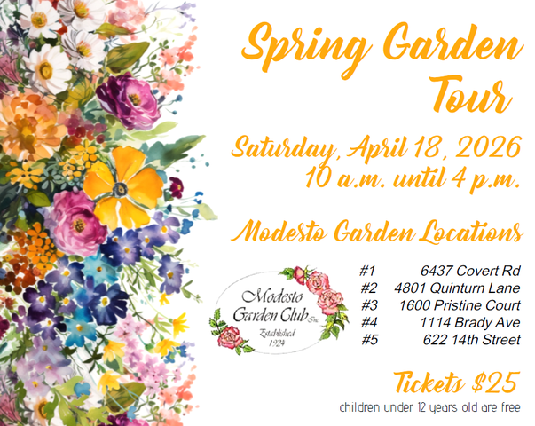 On Saturday, April 18, 2026 the Modesto Garden Club, Inc. will host the annual Spring Garden Tour. The Modesto Garden Club hosted its first Spring Garden Tour in 1932 with three gardens. This year the club hosts five self-touring gardens on April 18 from 10 a.m. to 4 p.m.