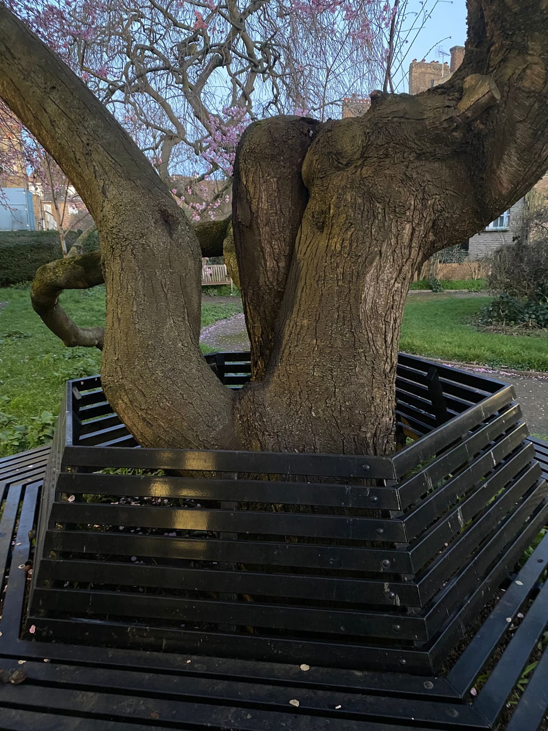 As you can see in the third pic the bench isn't touching the trunk, and I can't move it anyway, also arguably it prevents people from walking too close to her root flare is nice and visible.