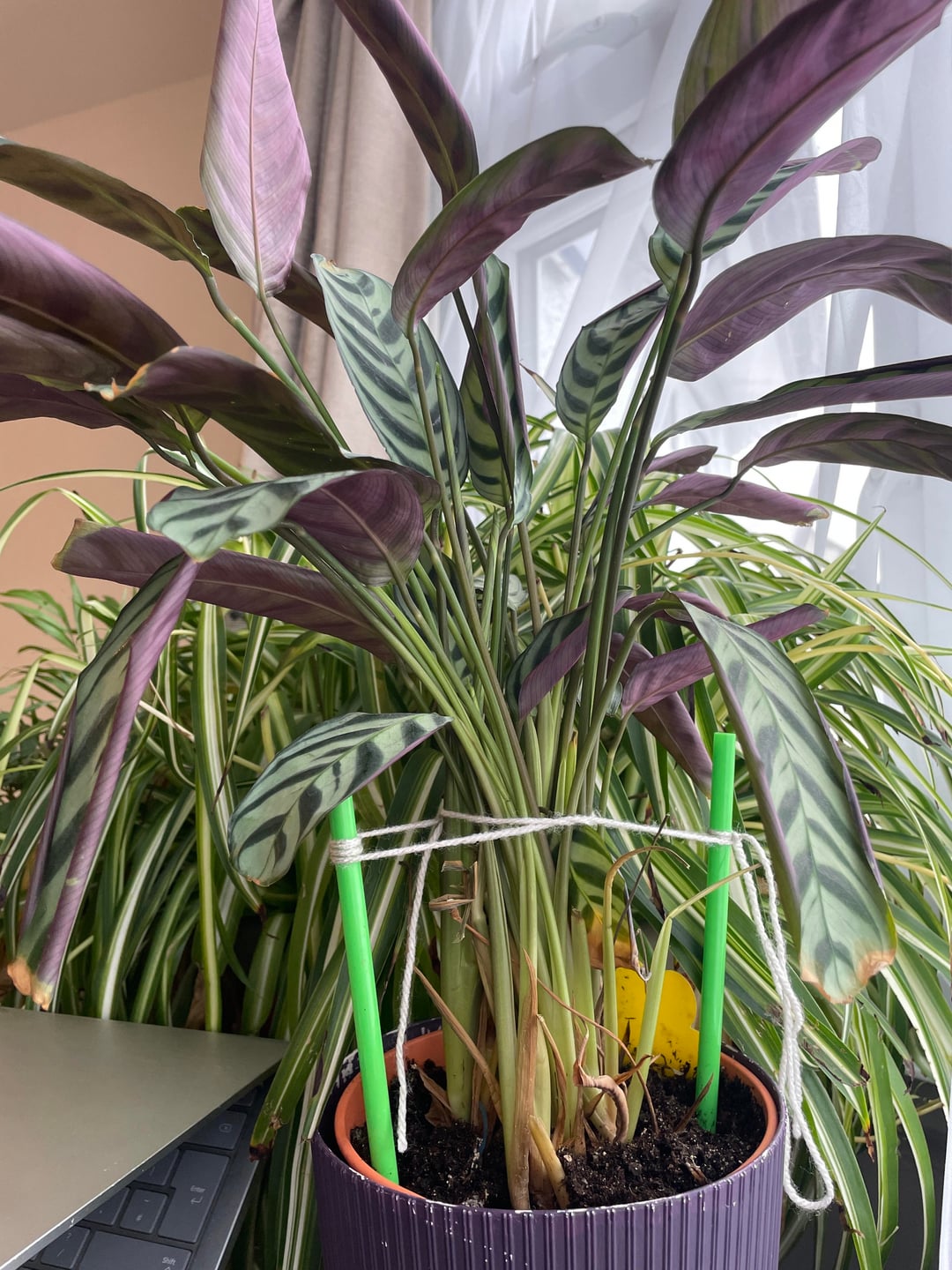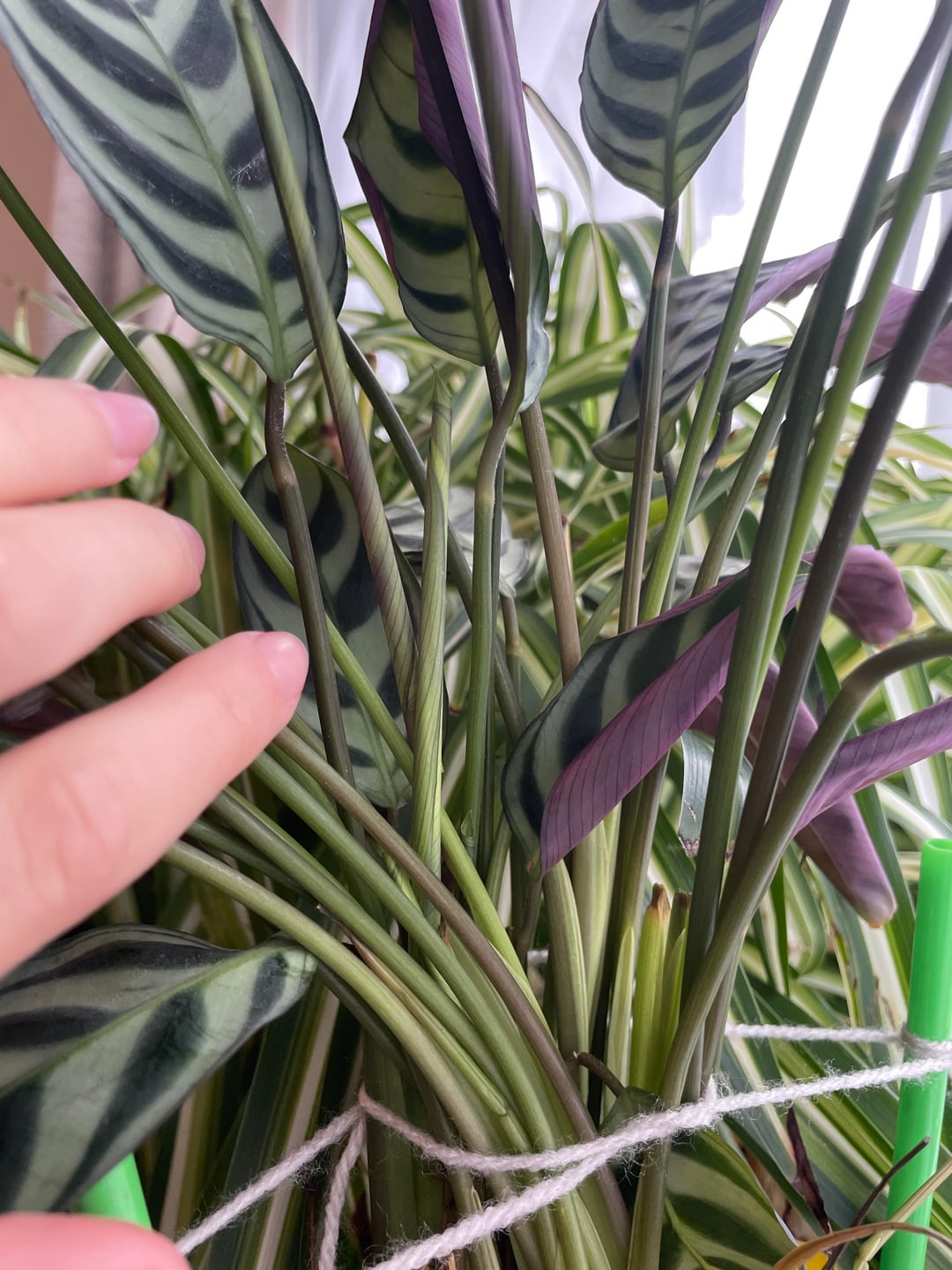 i went away over Christmas and came back to a very droopy calathea (i had forgotten to water it before i left). over the last couple of months it hasn’t really improved. I’ve moved it into more light today but given it was happy in its previous position (south facing room but not too close to the window), maybe that’s not wise? this is all the result of bad plant parenting but is there anything i can do?! it has a couple of new leaves but they’ve not grown much. it also is being held upright by yarn, without the yarn it is super droopy