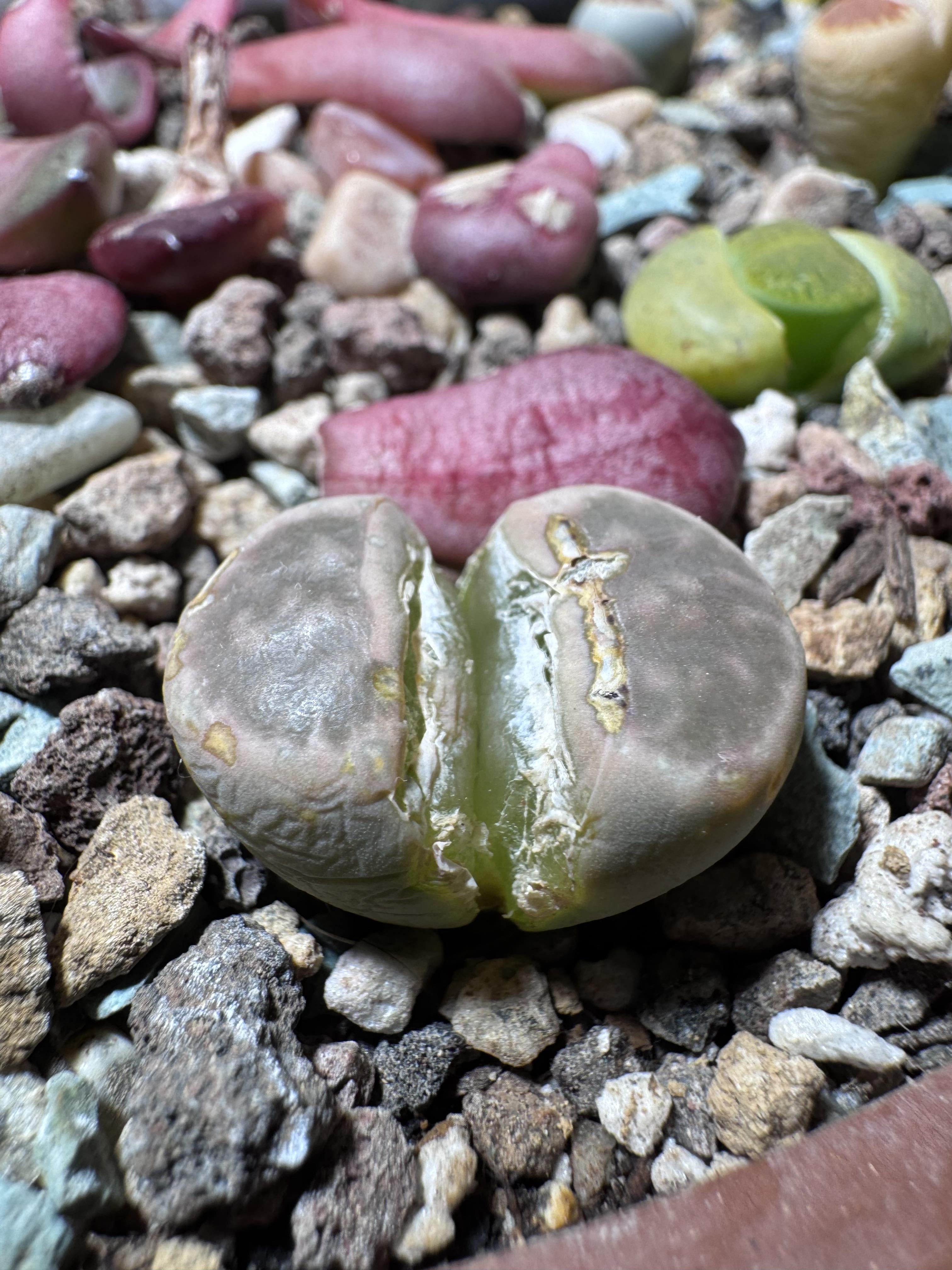 When this one split open…nothing there. I’ve had this happen before—and there was a hole, literally nothing there. Both halves are firm like there something in there. Thoughts? by Character_Age_4619 lithops 1 Comment LaGrotescaBetty 3 days ago Looks like over watering