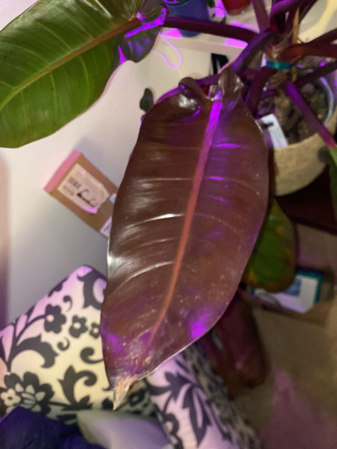 I just got this big philodendron bipennifolum 'sun red' a few weeks ago ago. A few days ago I set it up with a purple grow light for 8 hours since during the day the room gets medium bright but not I credibly bright The new growth is fine and it's still growing new leaves but the coloration is really weird. The brown/yellow isn't crispy it feels the same texture as the rest of the leaf. The last picture is from the day I got it, so it definitely has some natural discoloration but I'm not sure how much of it is normal.