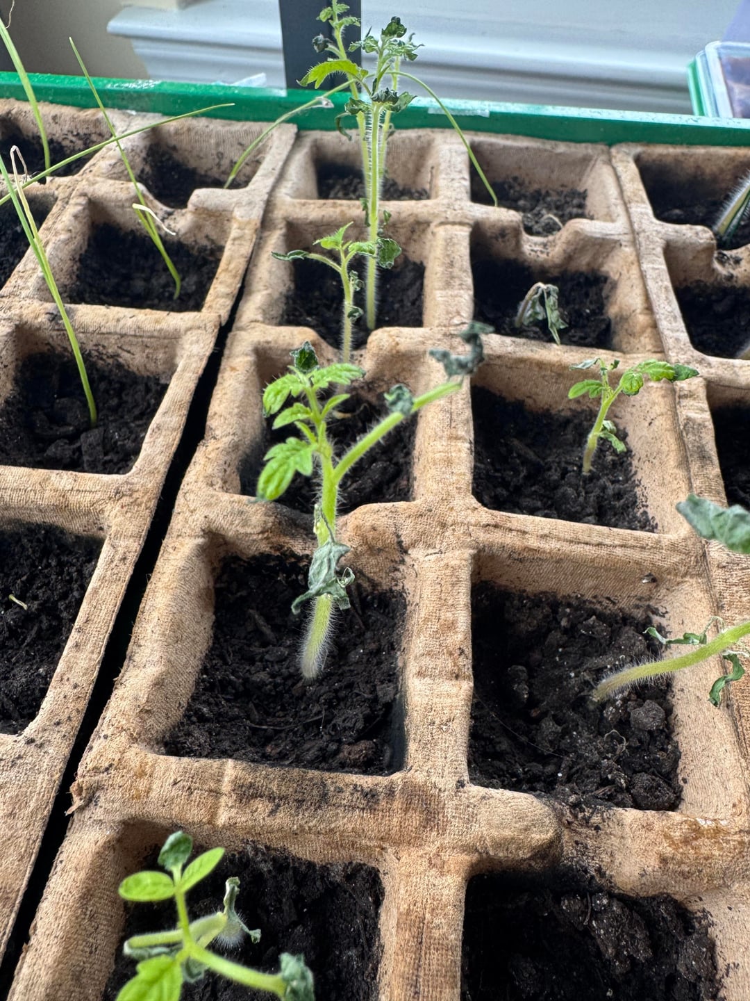 Everyone looks overwatered! You might need to start again… overall I’d recommend skipping the compostable seed starting trays. Something with drainage holes is better for delicate seedlings