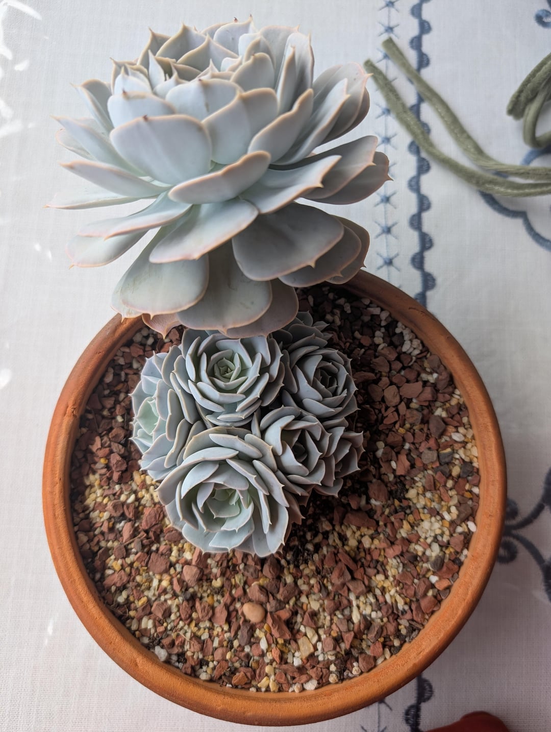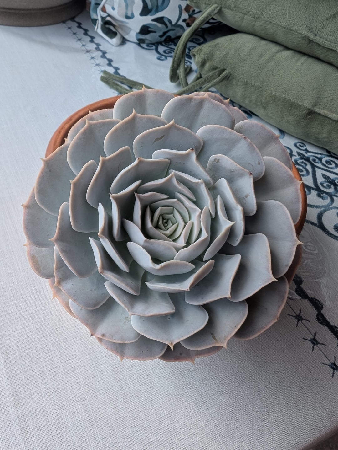 It’s very beautiful and looks healthy. It’s compact and showing no signs of etiolation. I’d just leave it, honestly. A lot of people like to behead their echeverias and keep them low-growing but then you never get stunning mature specimens like this. A lot of echeverias will grow longer trunks when you leave them alone and trail downward over the edges of their pots, which is what I expect yours will probably do.