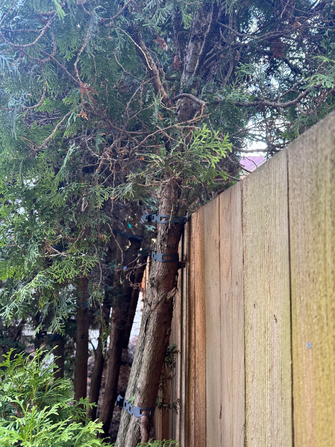 I'm a new homeowner who heard a creaking noise in the backyard and discovered this tree leaning against the fence. Every time the wind blows, the fence creaks. I tried calling an arborist and it's a 2-4 week wait for site visits, then 8 weeks until they can do work.