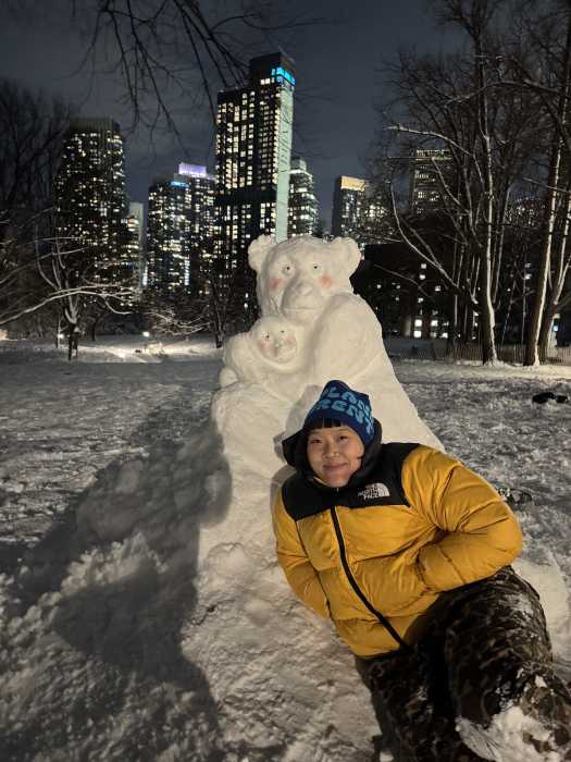 Ameya Okamoto beside her snow sculpture of Punch, a viral Japanese monkey, carved in Fort Greene Park after the blizzard.