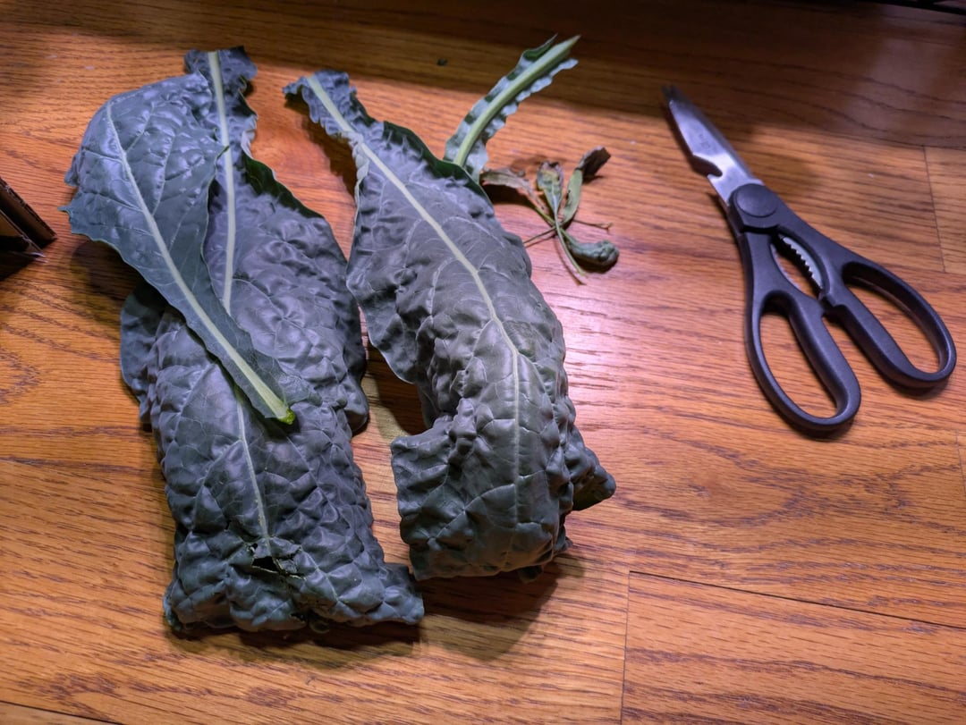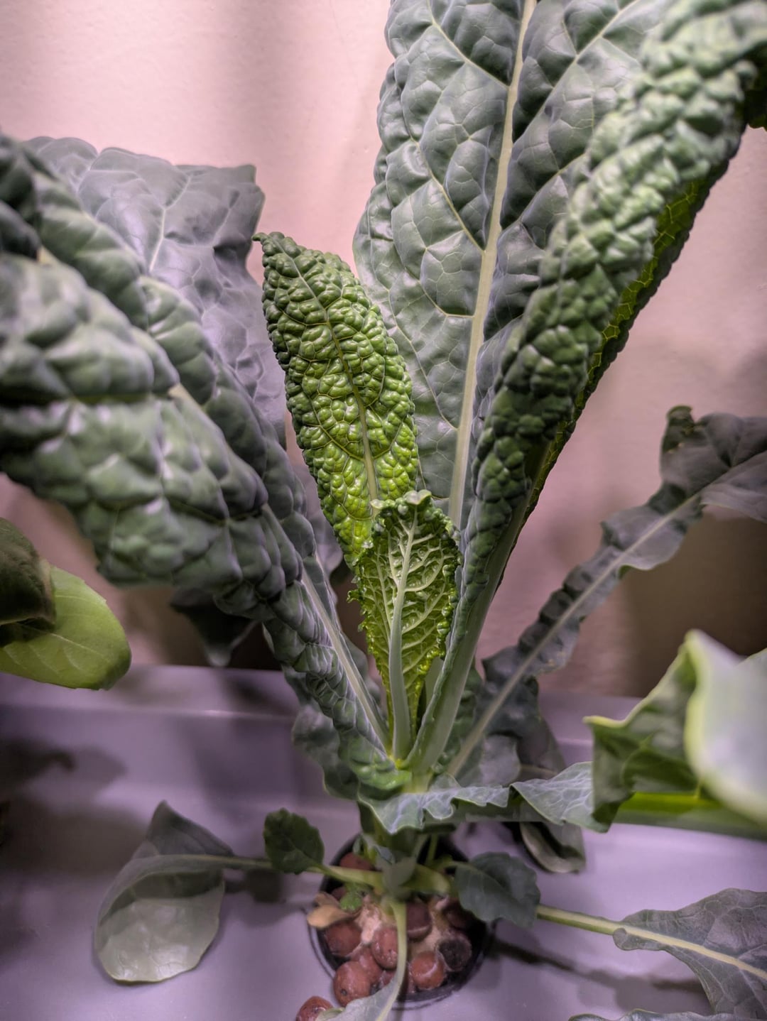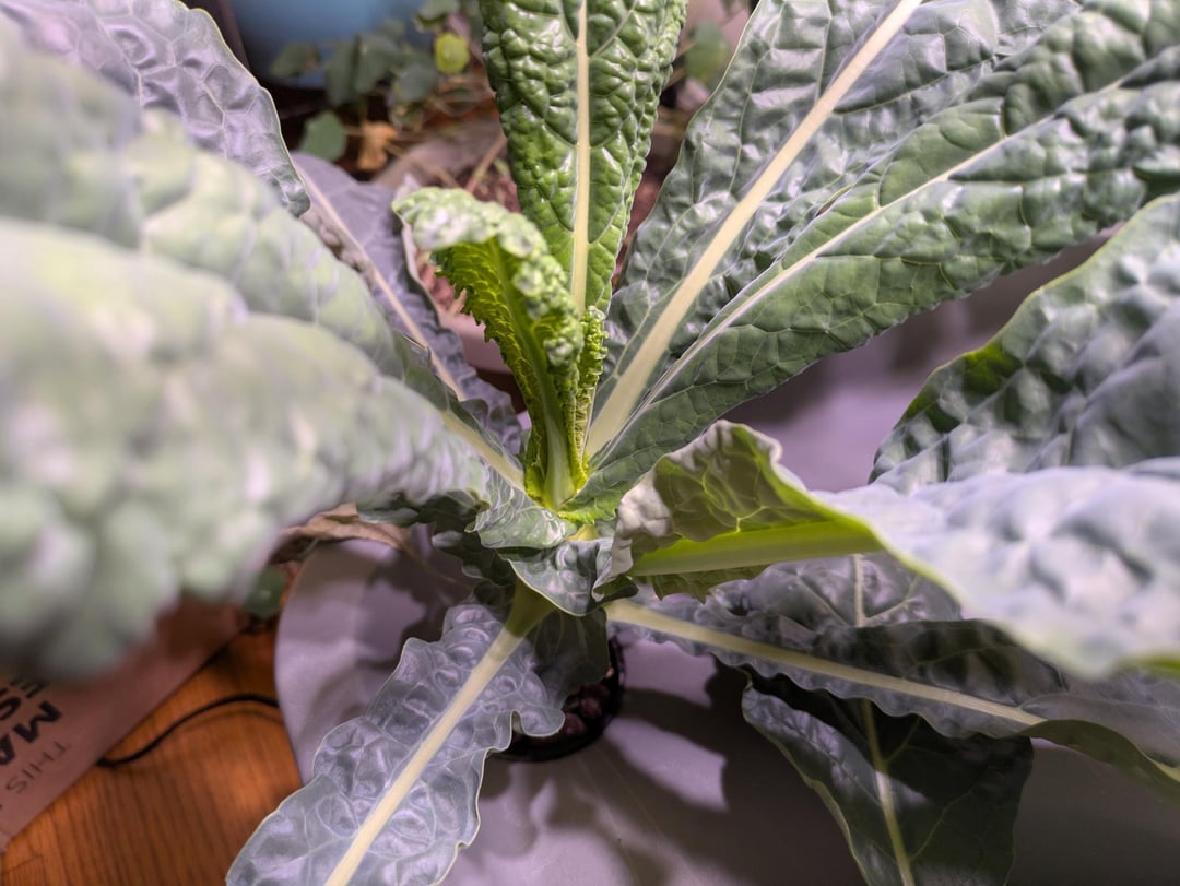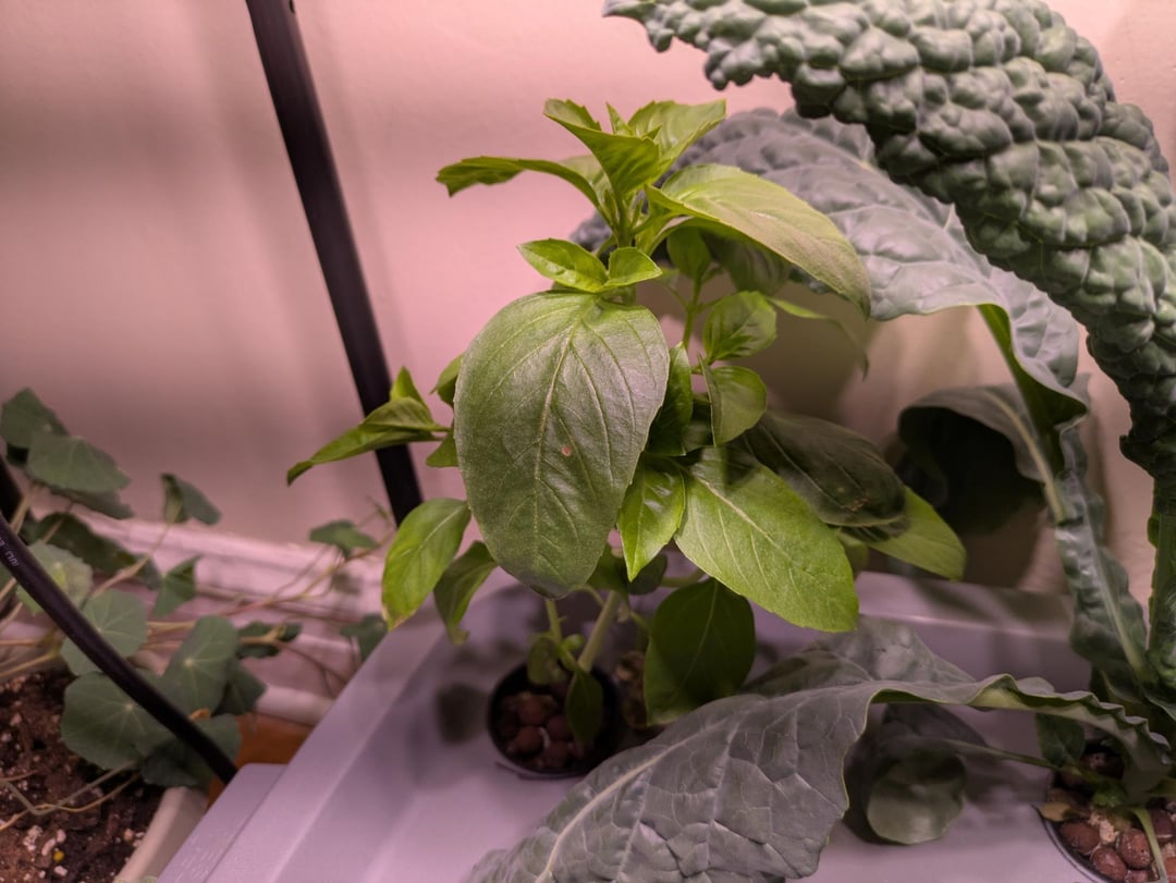 The Lacinato kale is now growing rapidly, same with the one Genovese basil. Realistically 2 out of the 5 kale were stunted, but three are very strong. I don't have enough space for all of them in this small area anyway so I think that's okay. I'm beginning to prune the lower leaves, which I think is a smart idea now that they're solidly rooted. This is about a month and a half since the initial germination.