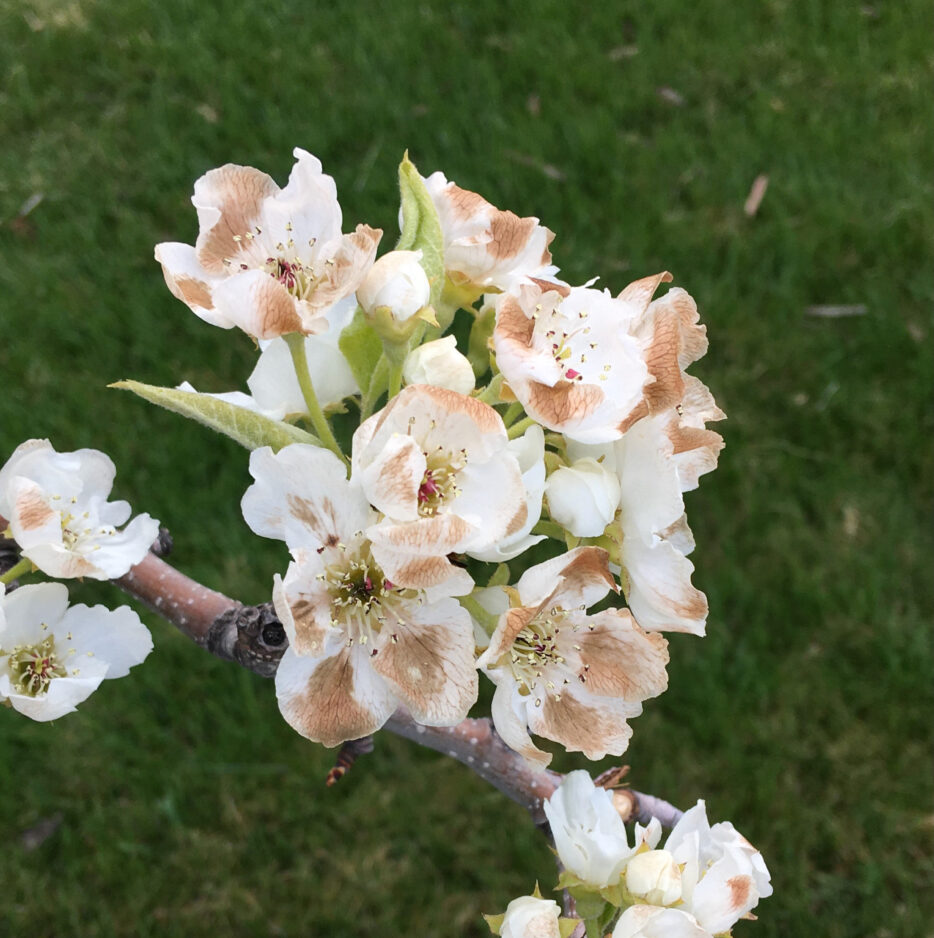 Almost every year in our valley, there will be a late frost somewhere that damages the blossoms on some fruit variety. The more open the blossoms, the more susceptible they are to frost damage. They’re damaged when unexpected freezing overnight temperatures and blossoms at a critical stage come together. The longer and lower the freezing temperature during a critical bloom stage, the high the percentage of fruit loss.