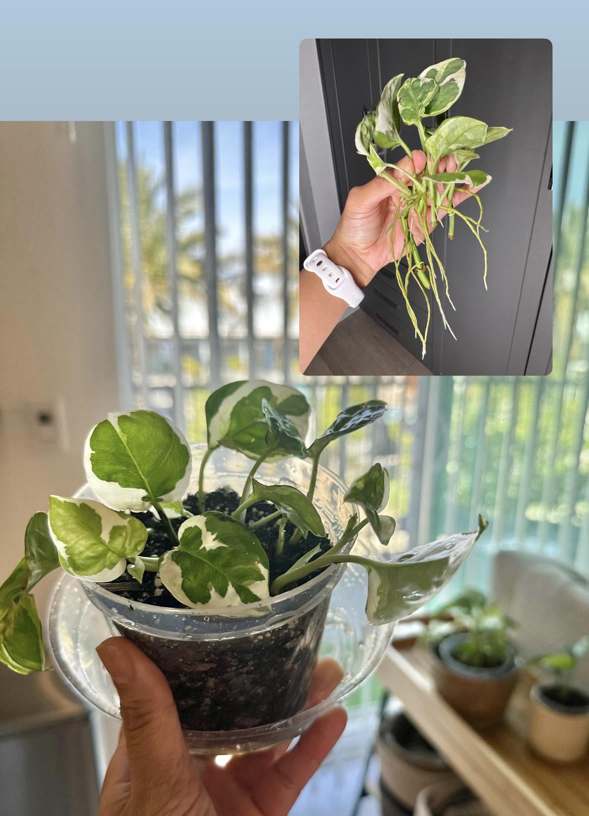 Took these cuttings from my sisters plant a month ago and just potted! New plant mom (est. 11/2025 lol), new pothos owner! (Yes there’s a baby marble queen in the back but also just got it and the roots were already way more established than this)