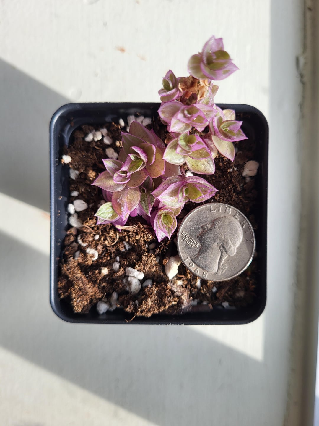 This was sold to me as a Tradescantia “Pink Panther” but the leaves seem smaller, shinier, and thicker than pictures of that species I have found (quarter for scale)