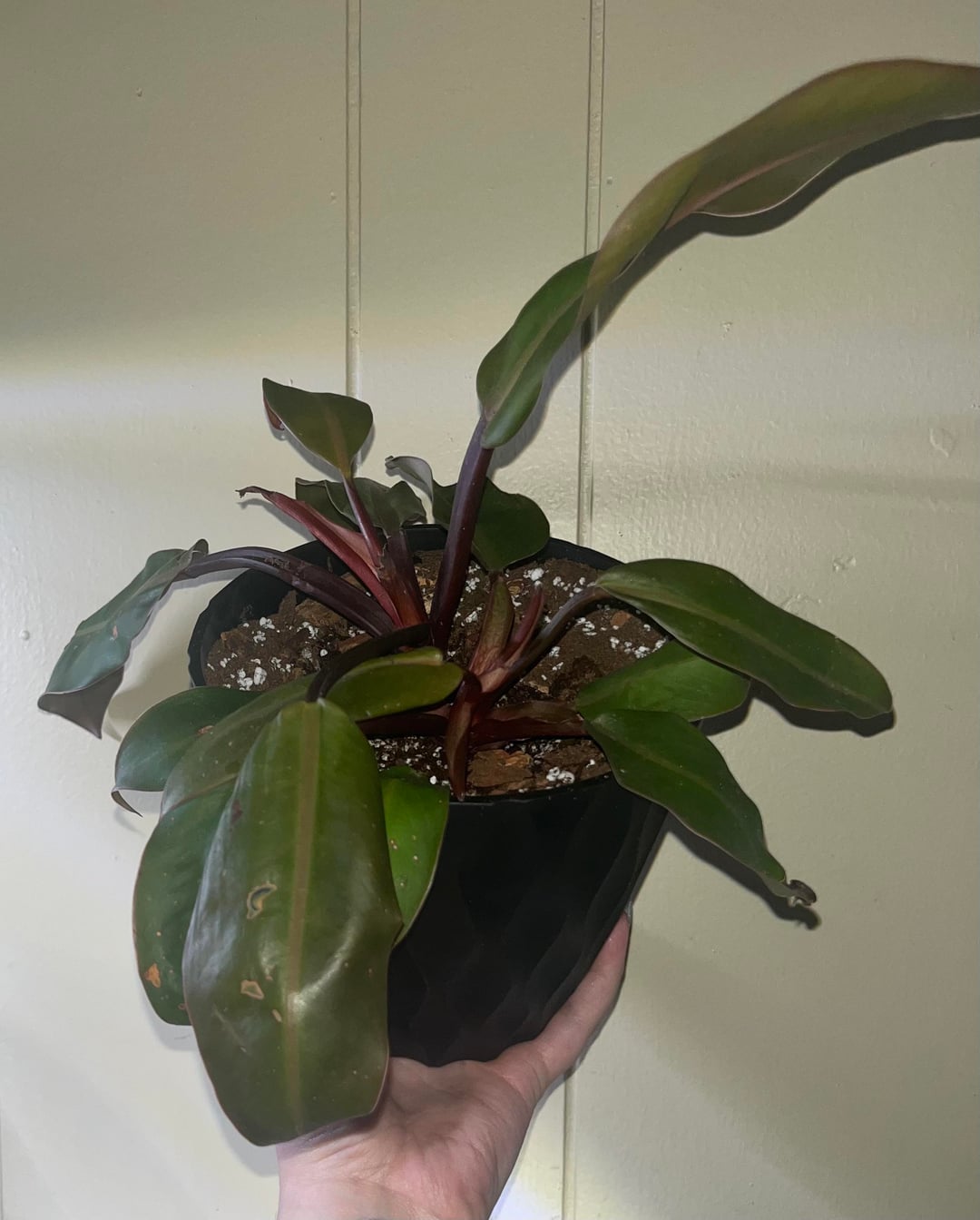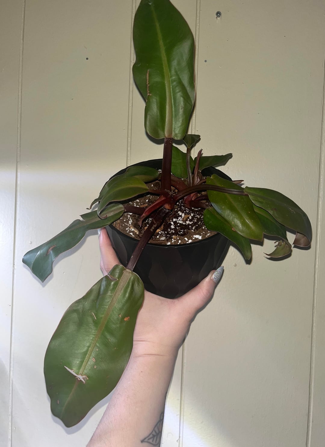I pulled up to a woman's house to buy one plant. She came out with a box filled with other plants in desperate need of some love and care. This Philodendron was one of them. Can someone please tell me what type it is? Also, I just repotted her so should I just leave the damaged leaves alone or chop them?