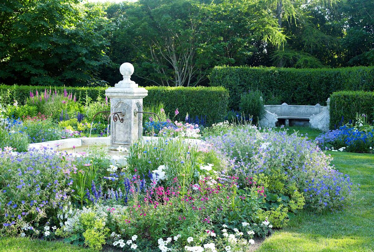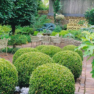 Boxwood sculpted into crisp-edged hedges, balls, cones, and spires forms the structural backbones for the gardens throughout the show, especially the Livingston estate. ‘Greenmound’ (shown) retains its bright green color all year and is particularly hardy.