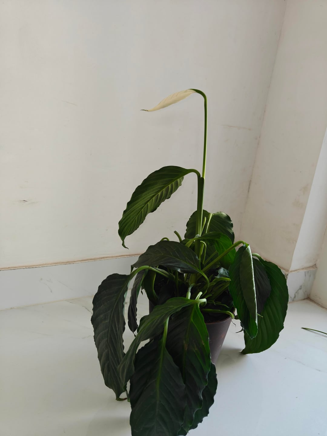 I noticed yesterday that my Peace Lily was overwatered and showing signs of root rot. I took it out, trimmed the rotten roots, and repotted it into fresh, dry soil.