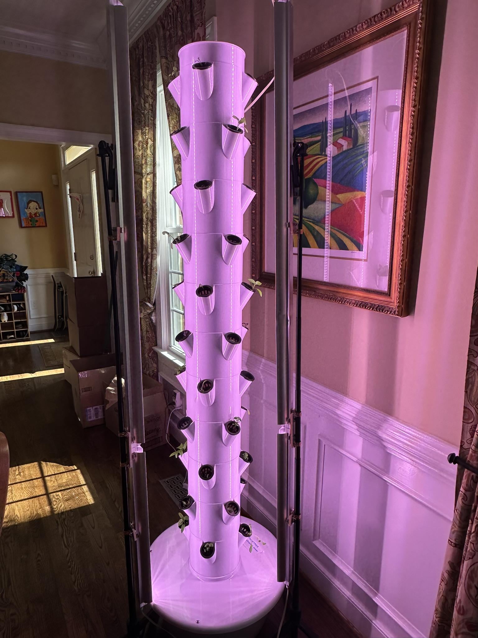 On a whim, I purchased a hydroponic tower (11 levels, 4 cups per level, and about 75 inches high). I am not a good gardener, I don't know what I am doing, I just wanted to grow something that I could consume. I planted mint, lettuce, peppers, and basil and all seem to be growing pretty well. But, I don't know how I should add nutrients to the water or what nutrients would be most beneficial. I rigged up grow lights on cheap selfie sticks and moved the tower to my office because the rest of the family got tired of hearing the water flowing through it 15 minutes per hour (I enjoy the sound). So, if someone can recommend nutrients, and what plants would be best suited to this device, I would really appreciate it.