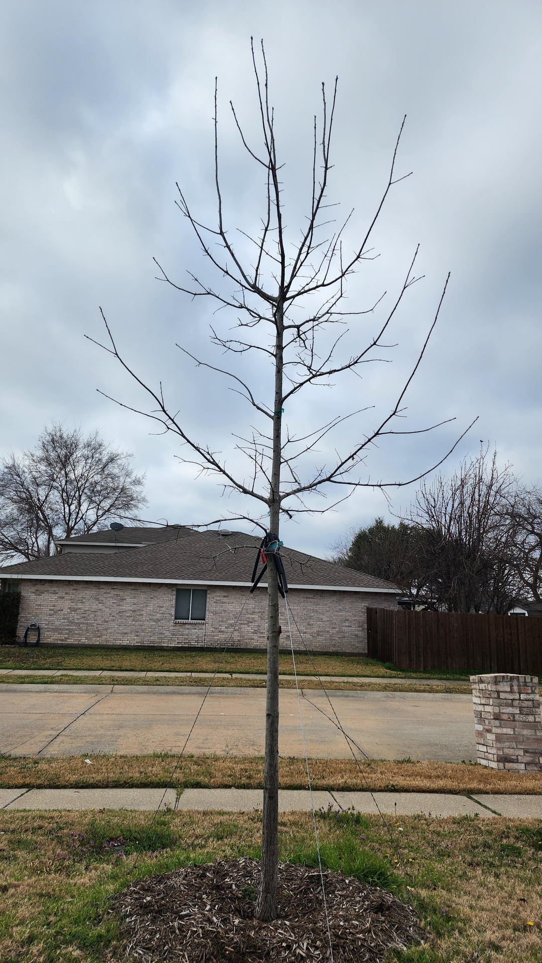 So I asked for some help from the tree people at the place I bought the tree (Fannin Tree Farms) to help me choose a good shumard red oak and they suggested 3 different options that they thought were good candidates to take home. I ended up liking this one as it seemed to be growing pretty straight and seemed more full than the others, and I THOUGHT it had a central leader, but I think the leaves were covering up the fact that the central leader seemed to have been cut off a long time ago to possibly encourage this branching I'm assuming?